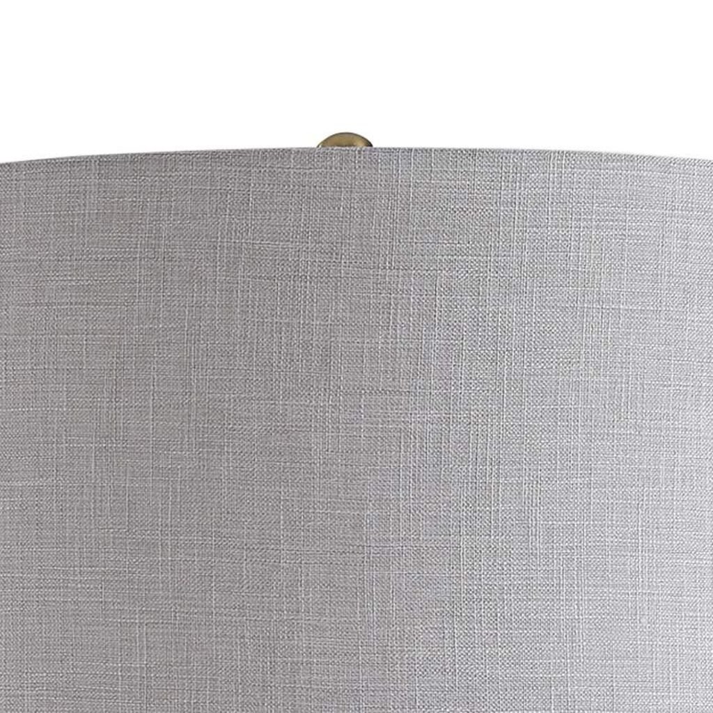 The white linen shade diffuses light evenly, producing a soft glow that enhances the warmth and character of the lamp’s base.