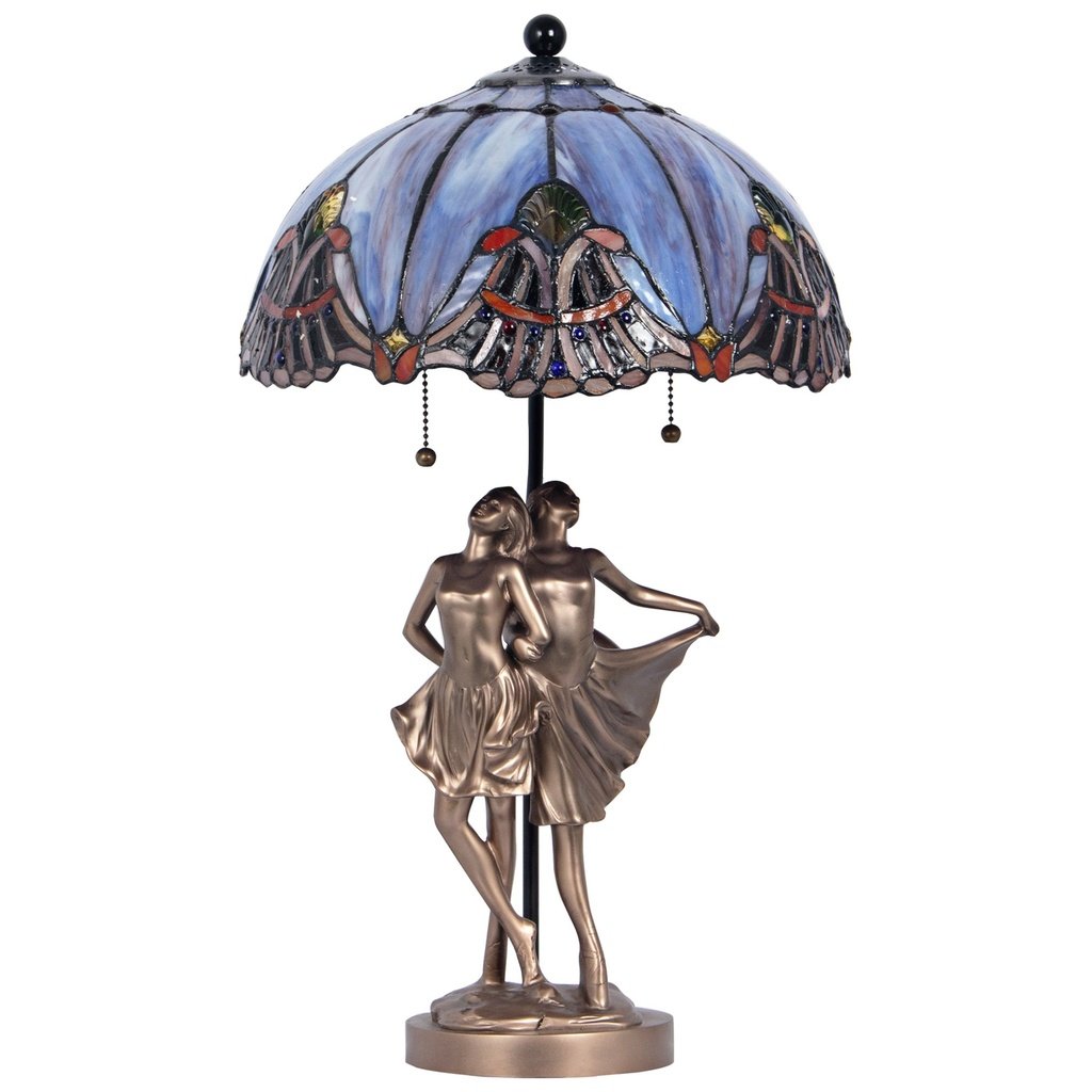 This Tiffany table lamp brings the handcrafted artistry of the Tiffany tradition to a compact, elegant form inspired by the grace of a ballerina. Each shade panel is individually cut and assembled using the copper foil method, producing a stained glass surface that glows richly when lit. The pull chain switch is convenient and in keeping with the traditional Tiffany lamp format.