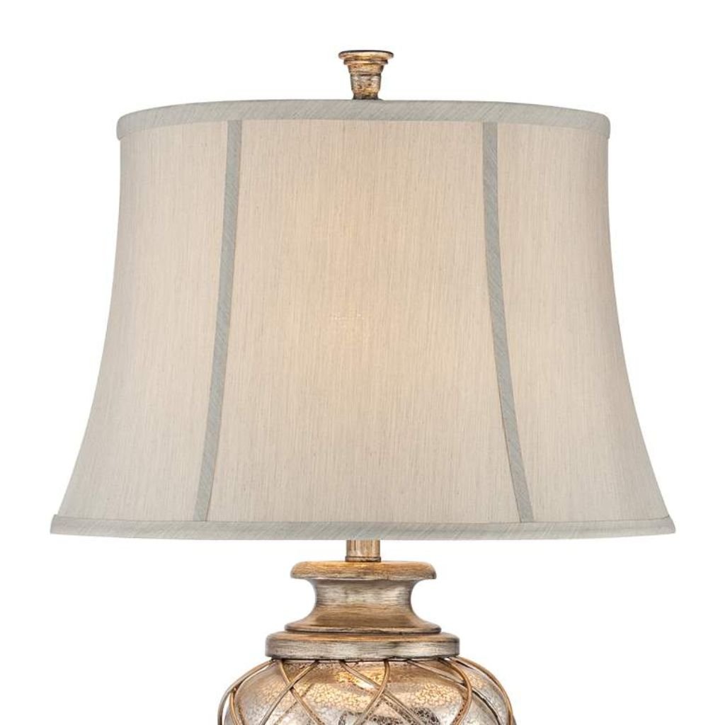 These table lamps feature a mercury glass body adorned with a silver swirl lattice pattern. The Olde silver finish pedestal base, crafted from durable cast resin, complements the off-white mist fabric bell shades, creating a sophisticated traditional look.