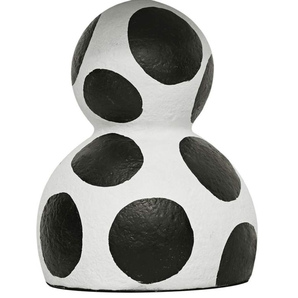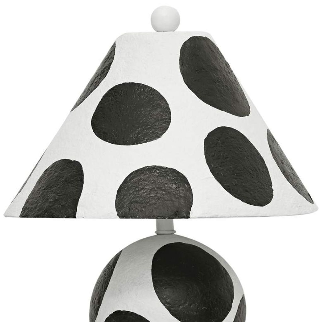 The base of the Lerici table lamp stands 14 inches high and 8 inches wide, crafted from durable papier mâché with iron hardware accents. Its curvy silhouette is enhanced by a bold black-and-white polka dot pattern, creating a fun and playful aesthetic. This modern design brings personality and movement to your space while remaining lightweight at 4.7 lbs.