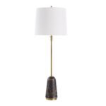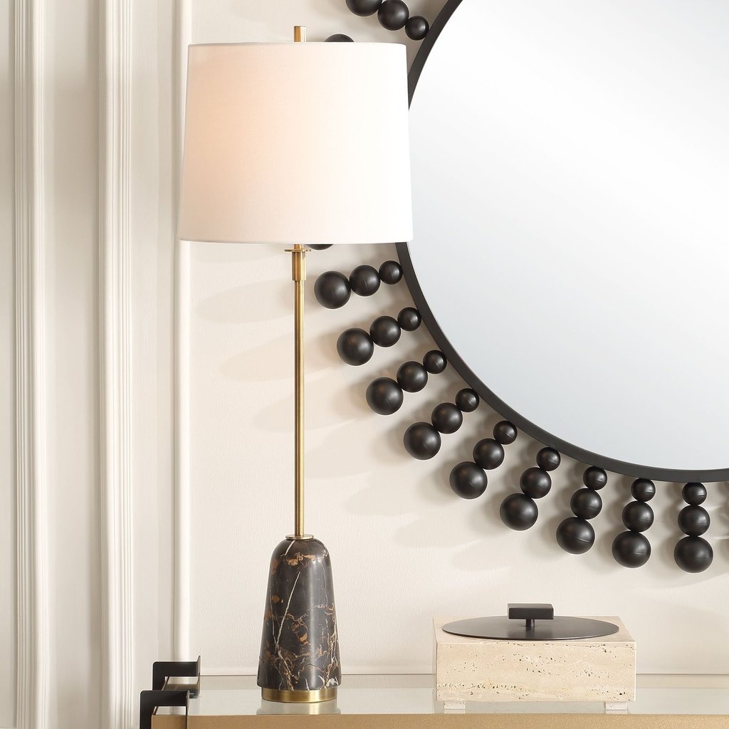Marble gives this buffet table lamp its rich black body with brown and white veining — a surface that changes subtly depending on the angle of light. The plated brushed brass metal base grounds the piece with warmth, and the crisp white linen shade on top keeps the overall look polished. This is a genuinely elegant buffet lamp that suits glam, modern, and transitional interiors alike.
