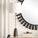 The plated brushed brass base provides a warm metallic contrast to the dark marble above. Brushed brass has become one of the most popular metal finishes in contemporary interiors, and it works here without feeling trendy.