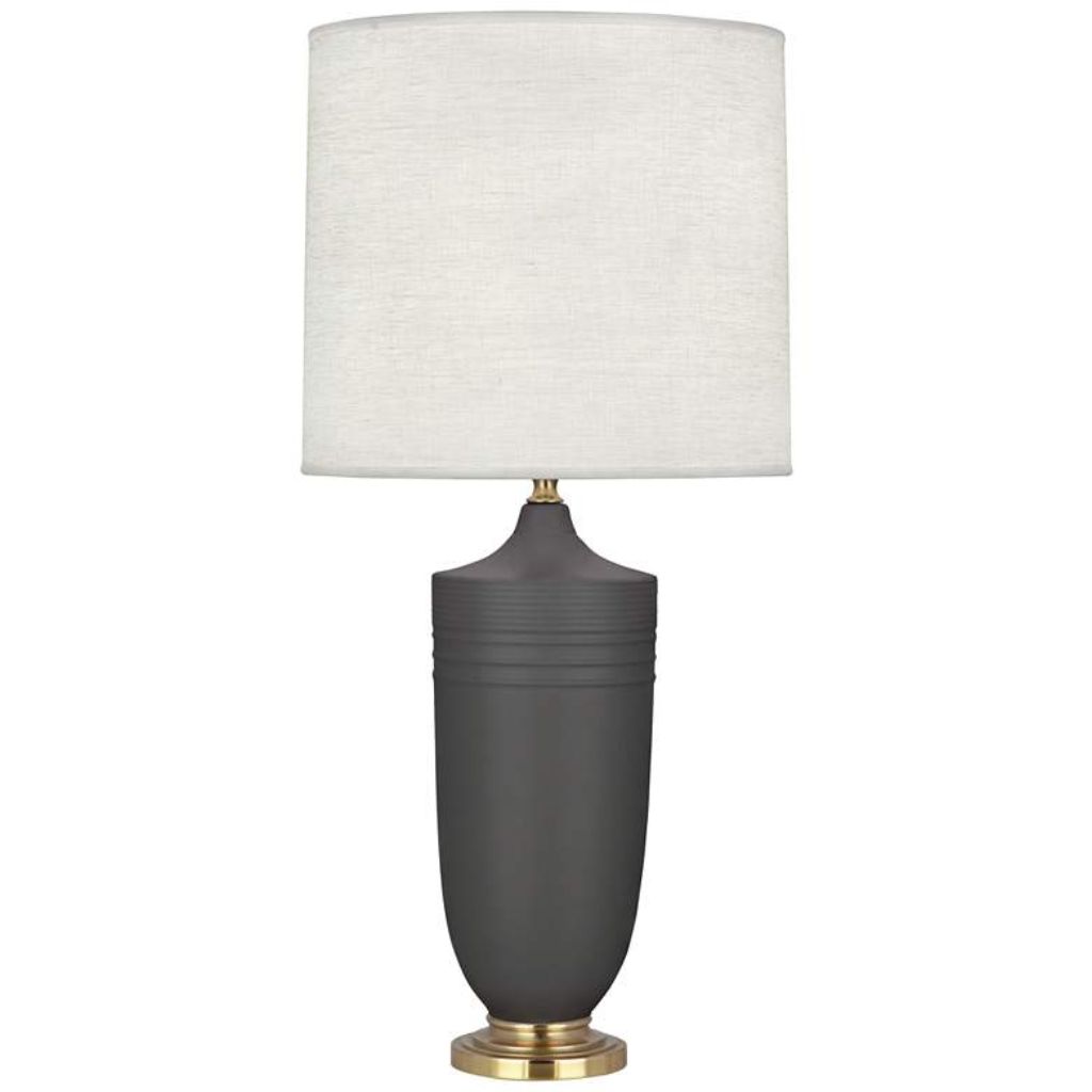 Crafted in the U.S.A., this ceramic table lamp pairs a matte ash glazed ceramic body in an urn-inspired profile with modern brass finish accents — a combination that feels genuinely refined without leaning into traditional or overly formal territory. An oyster linen shade and hi-lo dimmer at the socket round out a lamp that is as considered in its function as it is in its form.