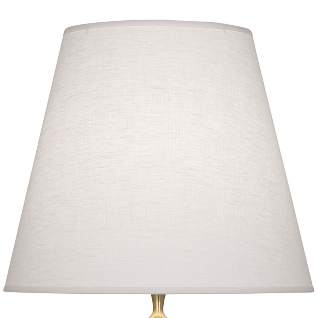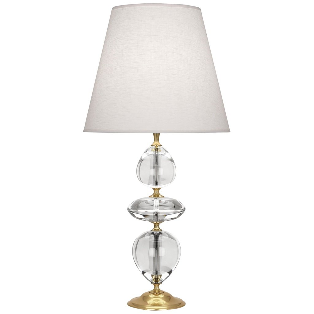 This crystal table lamp pairs modern brass finish steel construction with clear crystal accents, creating a look that is simultaneously classic and contemporary. The Shannon oyster linen empire shade softens the combination, giving it a relaxed warmth that suits traditional, transitional, and modern living rooms equally well. The brass finish catches the light from the crystal accents and bounces it gently around the shade, creating a warm, layered ambiance.