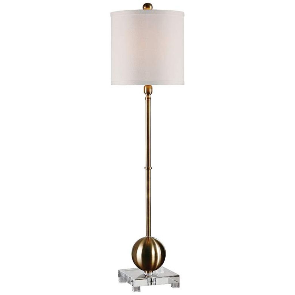 Built from metal and crystal glass, this buffet lamp brings a clean, contemporary sensibility to any space it occupies. A slender column base coated in brushed brass rises from a square clear crystal pedestal, with a large spherical accent breaking up the vertical line in a way that feels intentional and sculptural.