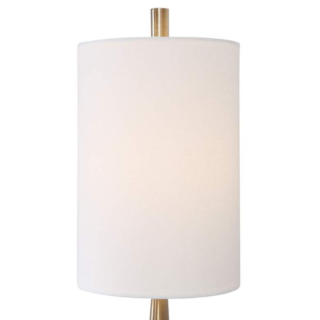 The steel base with a plated antique brass finish pairs beautifully with a polished white marble accent at the tapered base, creating a luxurious and sophisticated aesthetic. This combination of metal and marble ensures durability while introducing texture and visual contrast.