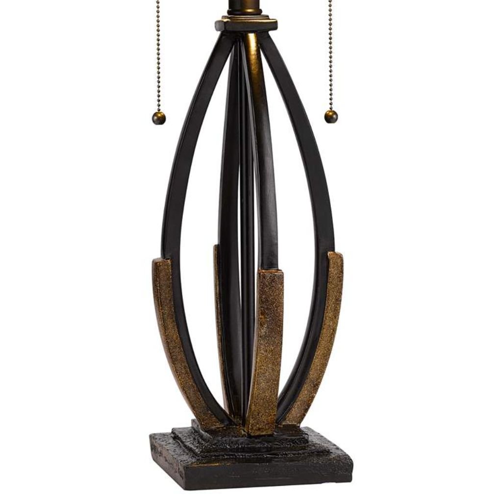 Supporting the intricate shade is a dark bronze base crafted from a combination of cast resin and metal. Sweeping ribs extend from the base to create an open, airy silhouette, adding visual interest and structural elegance. The square base measures 5 1/2 inches wide and provides a stable foundation for the 23 3/4-inch overall height of the lamp.