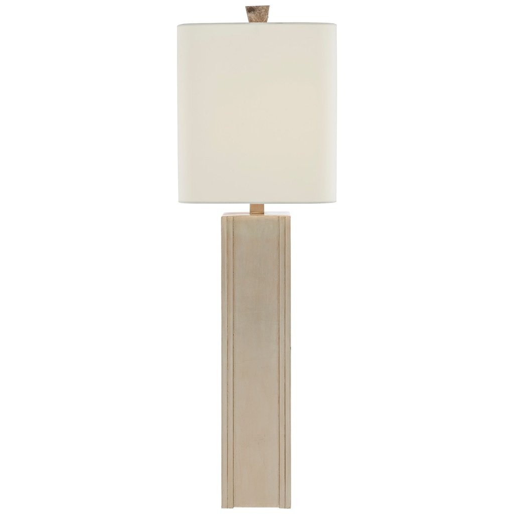 The mica shade is one of this lamp’s most appealing features. When lit, mica transmits a warm amber glow that feels rich and cozy—completely different from the cooler output of a standard fabric shade. Silver leaf wood accents complement the natural tone of the mica beautifully.