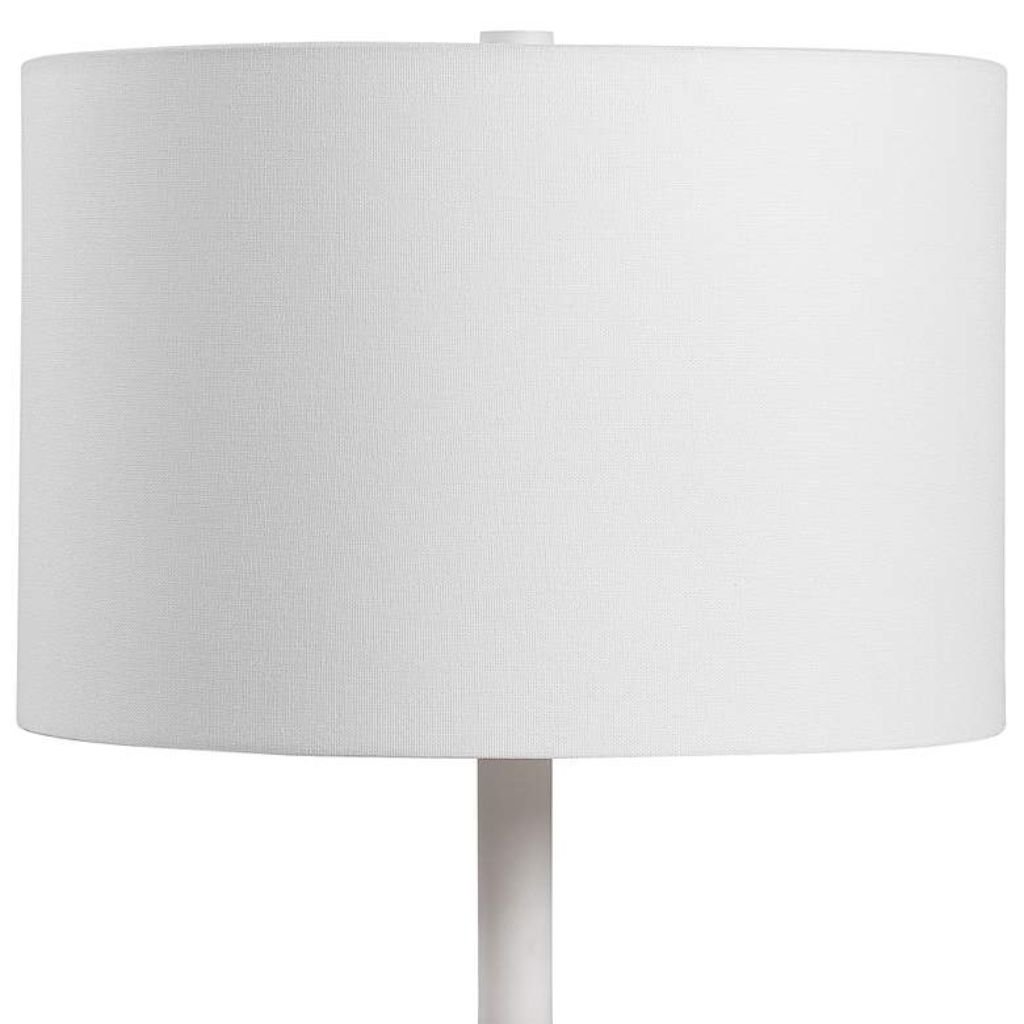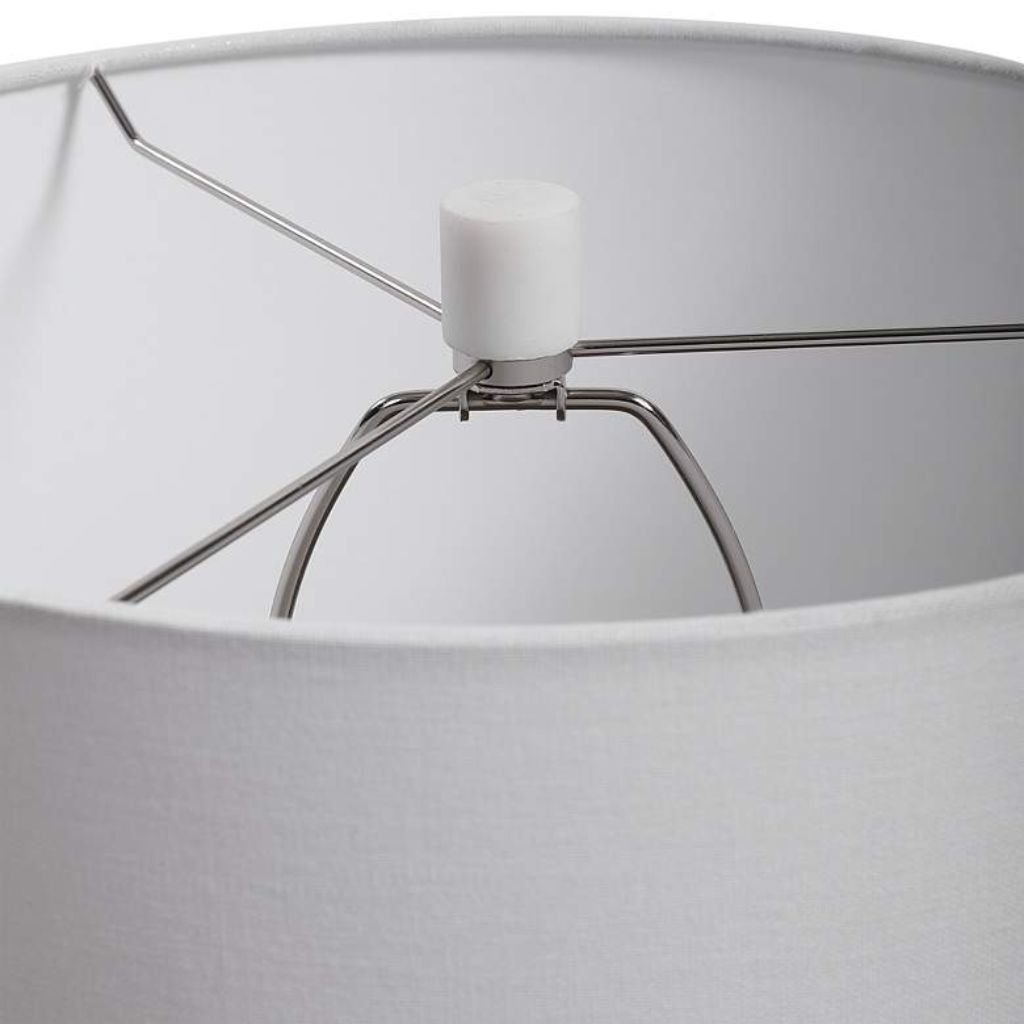 The round white fabric hardback drum shade diffuses light evenly across its 15-inch width, producing a soft, ambient glow rather than direct, focused illumination. The hardback construction maintains the shade’s crisp circular form over time, preventing sagging or warping that can diminish a lamp’s visual appeal. A 3-way socket switch allows for three distinct brightness levels, making it adaptable for evening ambience, task-adjacent reading light, or full room contribution depending on the moment. The shade’s 10-inch height balances proportion against the lamp’s tall base without truncating its silhouette.