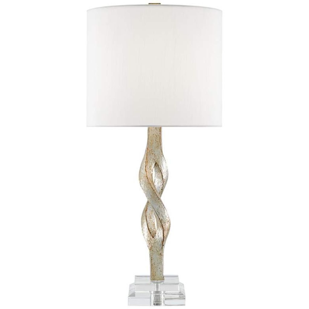 The design here is straightforward — a geometric twist column finished in Chinois silver leaf paired with a clear acrylic base that adds lightness without sacrificing structure. Built from composite and acrylic, this accent lamp brings a sculpted, high-gloss sensibility that works well in contemporary and glam interiors alike.