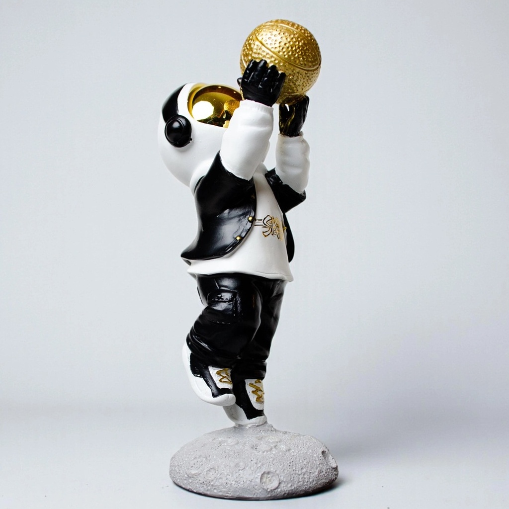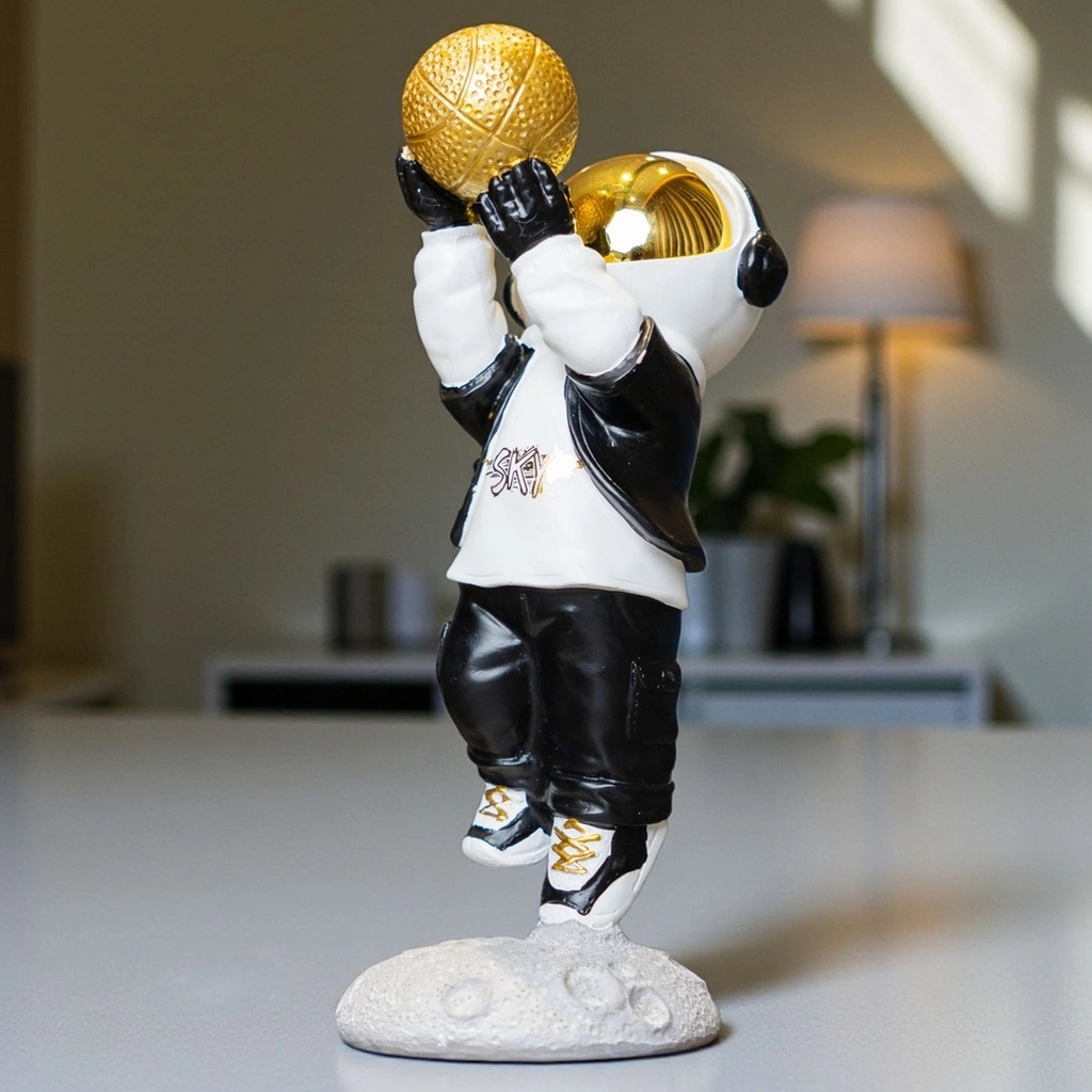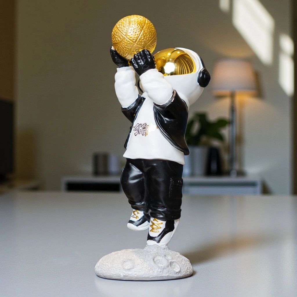 This figurine fits right in anywhere you need a bit of flair. Whether it’s on a living-room console, an office desk, or a bedside shelf, it adds a futuristic edge with its sleek black-and-white outfit and striking gold basketball. It’s a versatile piece that can stand alone or be part of a larger collection.