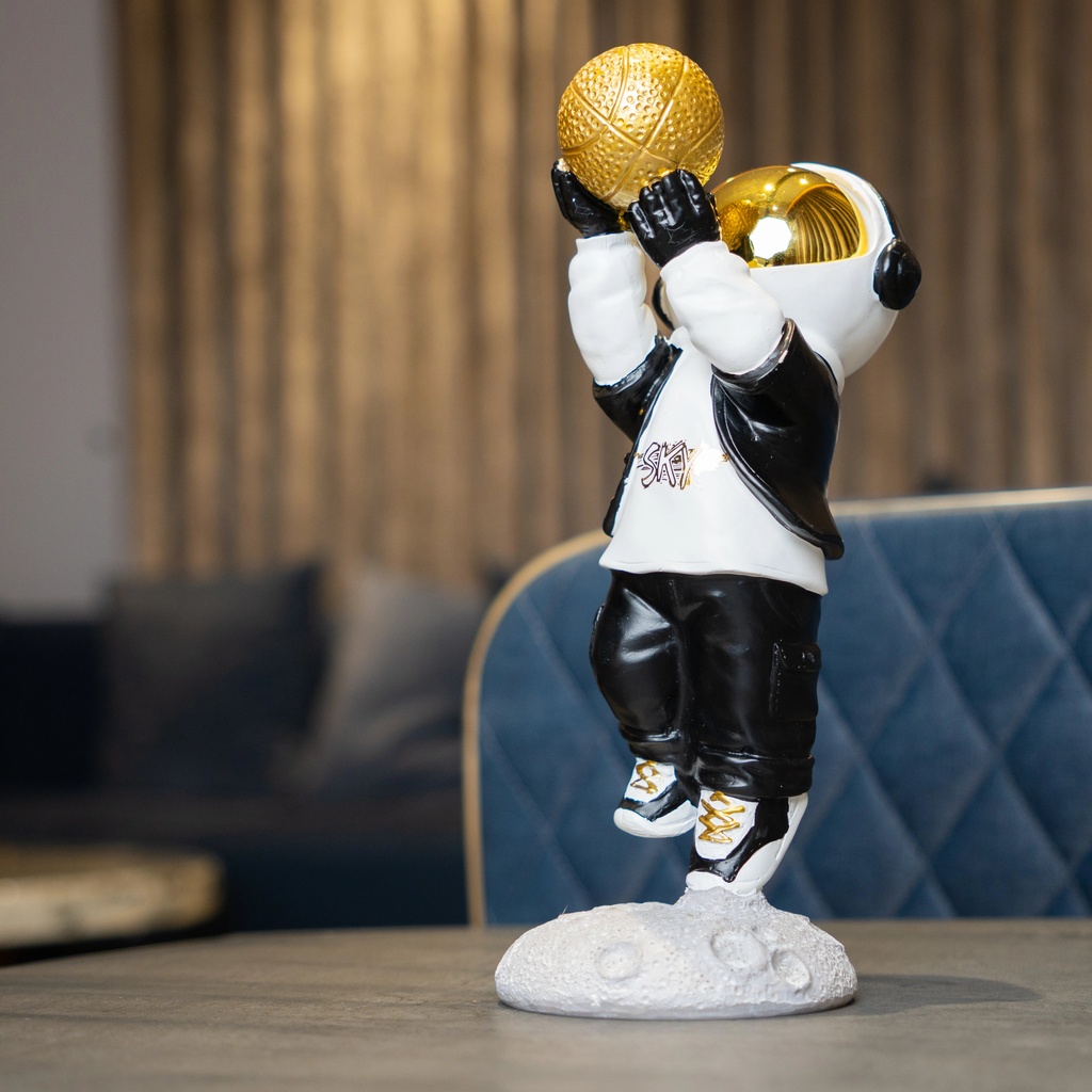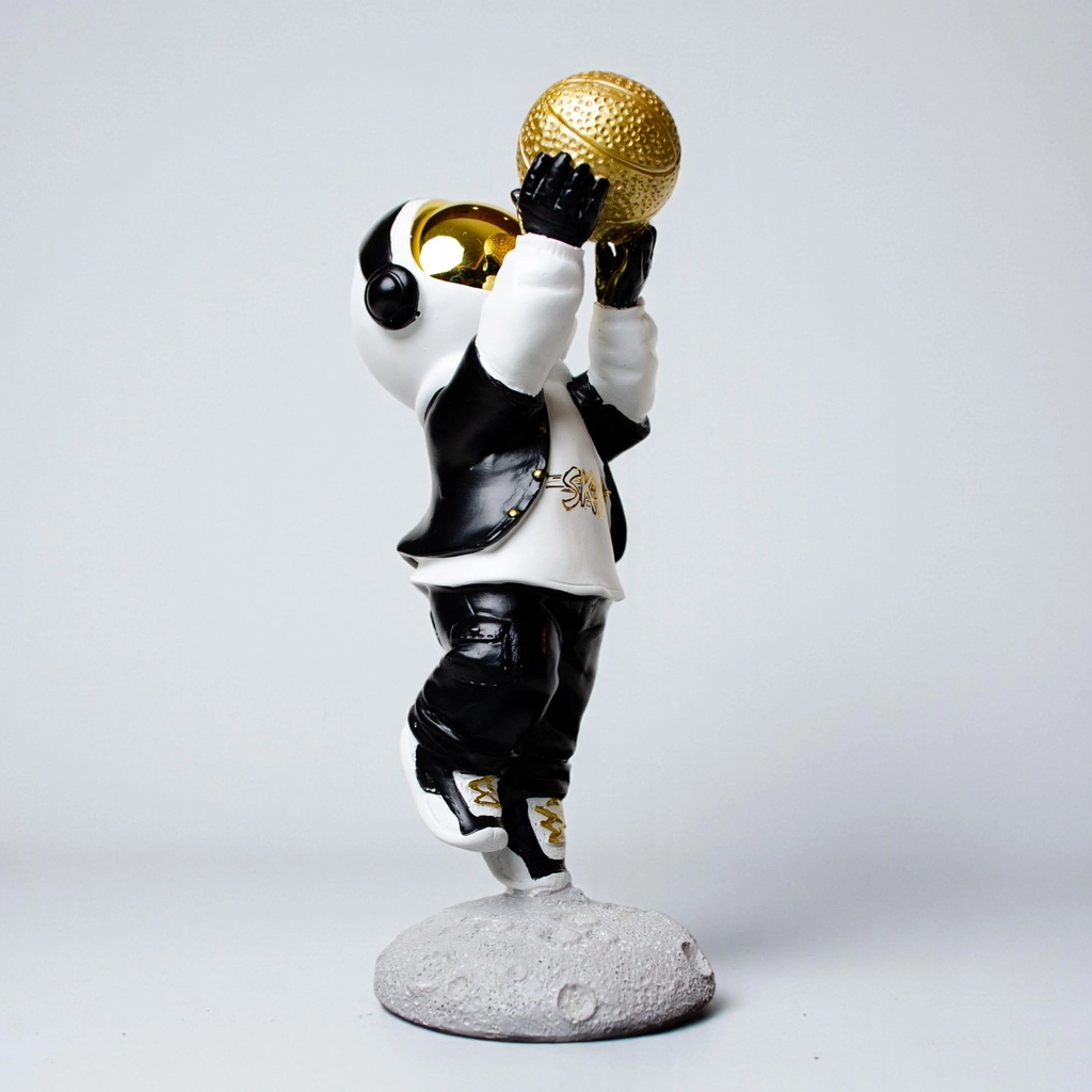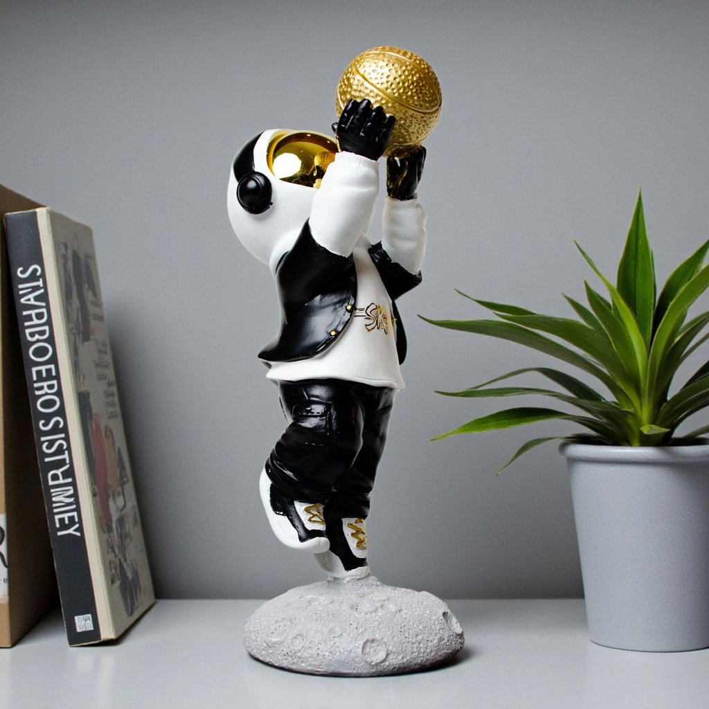 This figurine fits right in anywhere you need a bit of flair. Whether it’s on a living-room console, an office desk, or a bedside shelf, it adds a futuristic edge with its sleek black-and-white outfit and striking gold basketball. It’s a versatile piece that can stand alone or be part of a larger collection.