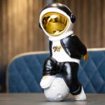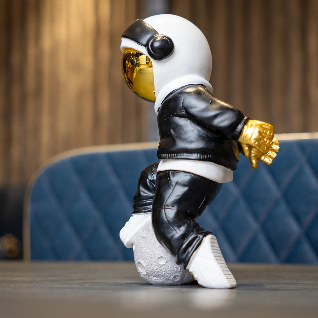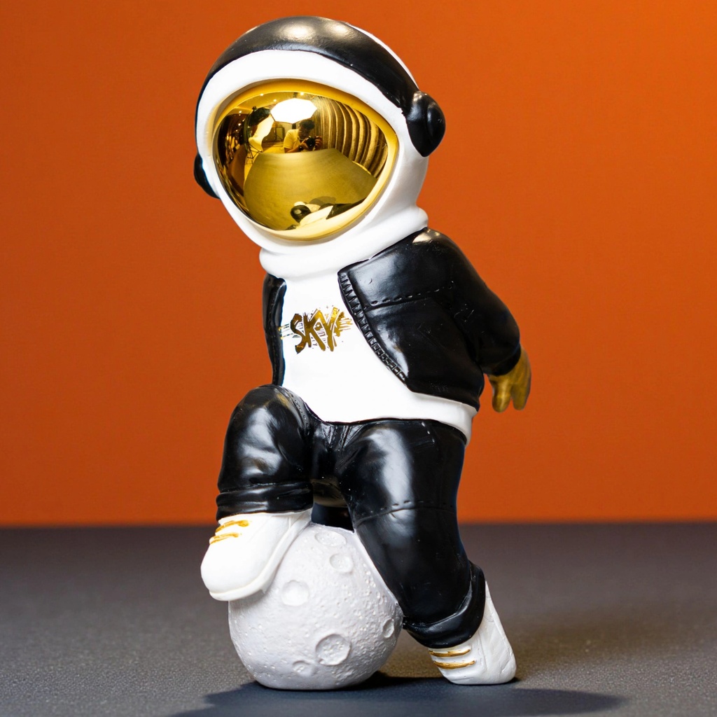 The Cosmic Voyager is crafted from high-quality resin and features a striking gold-plated visor. This design element not only catches the light beautifully but also gives the figurine a futuristic and otherworldly charm. Dressed in a sleek black-and-white streetwear outfit with metallic accents, the Voyager strikes a confident pose, resting on a textured moon sphere that symbolizes exploration and limitless ambition.