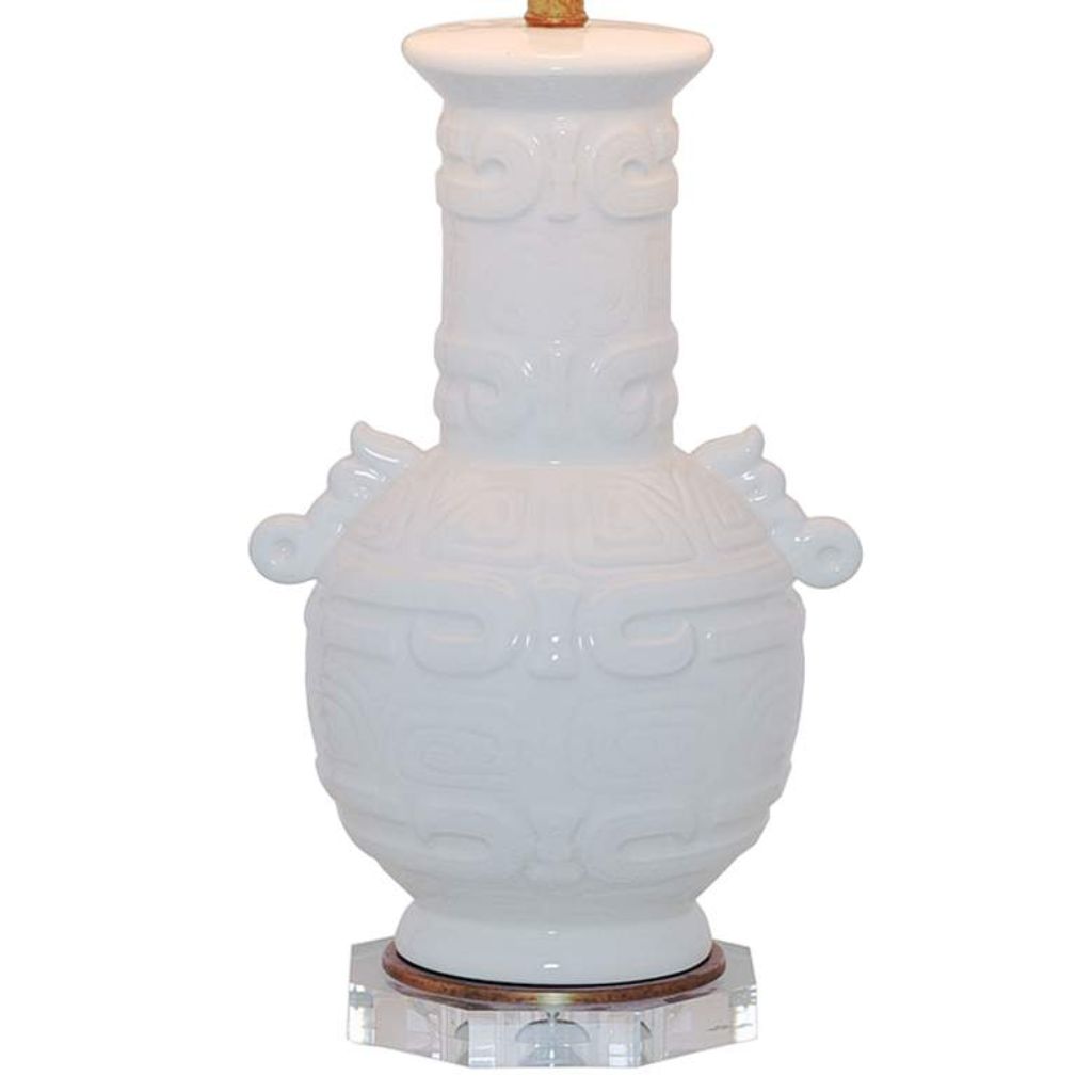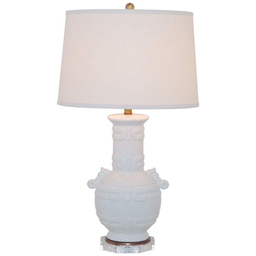 Built from hand-fired porcelain, this porcelain lamp features a cream crackled glaze finish with antique carvings cast directly into the base — Tibetan-inspired detailing that gives it a genuinely artisan quality. Aged brass hardware, an octagonal lucite accent at the base, and a natural linen drum shade complete the look.