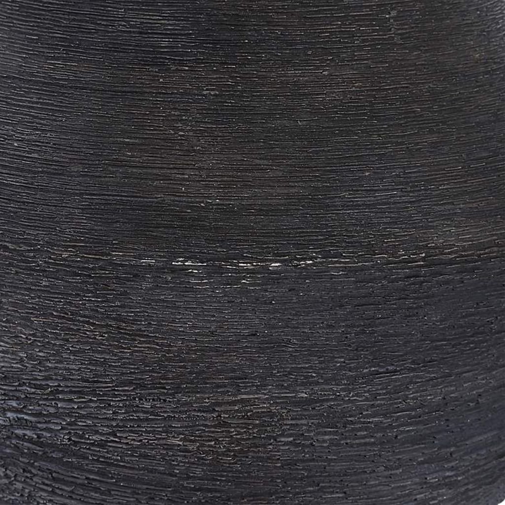 Standing 34 inches tall with a base width of 5 inches, this lamp features a ceramic body finished in a rich, rustic dark charcoal glaze. Horizontal textures across the body add tactile interest and visual depth, while plated brass accents bring a touch of elegance and sophistication.