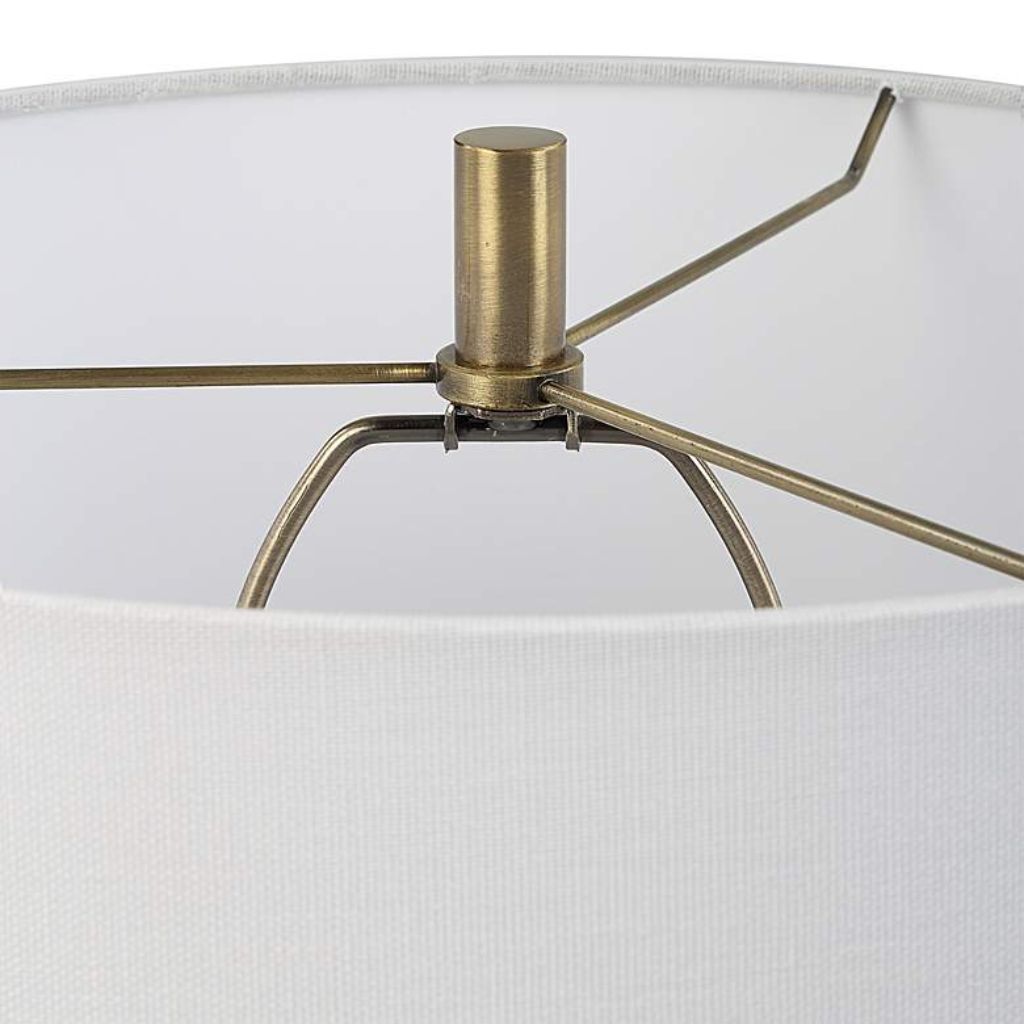 The lamp is topped with a white linen fabric hardback drum shade measuring 14 inches wide at the top, 15 inches wide at the bottom, and 10 inches high. The neutral shade softly diffuses light, balancing the bold base and offering a clean, versatile look suited to both traditional and transitional interiors.