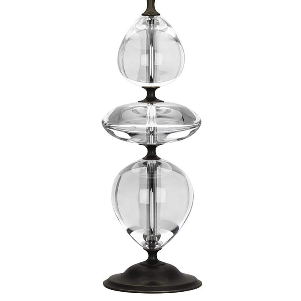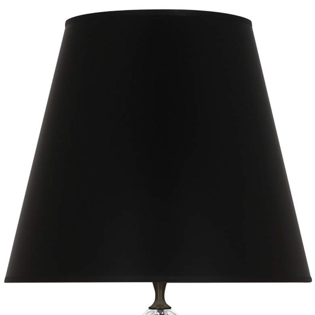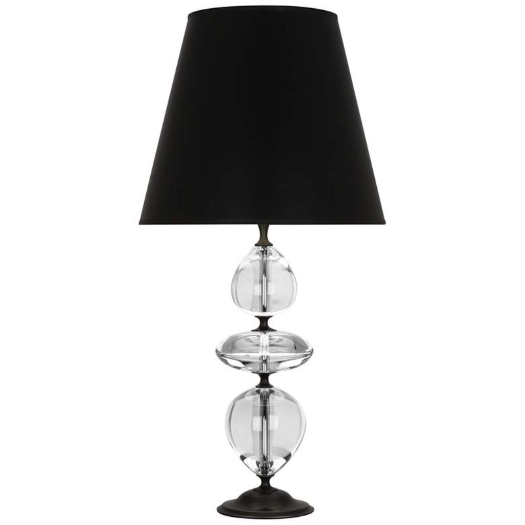 Three smooth clear crystal forms stacked in deliberate succession — each one catching and refracting ambient light independently before the column transitions into the deep patina bronze steel hardware above and below. The Orlando by WILLIAMSBURG and Robert Abbey is a lamp built on material contrast as a design philosophy: the near-black depth of the patina bronze finish set against the transparent luminosity of stacked crystal, and both of those set against a black opaque parchment shade with matte silver lining that closes the composition with dramatic, sophisticated authority. At 30.75 inches tall and 19 pounds, this crystal and bronze table lamp from the WILLIAMSBURG collection carries the material weight and formal confidence of a lamp designed with historical precedent behind it — the WILLIAMSBURG brand draws directly from the antiques, shapes, and motifs of Colonial Williamsburg, Virginia, where the collection’s design language was first established in 1936. The black opaque parchment shade with matte silver lining is the final design decision that separates this lamp from conventional crystal designs — darker, more dramatic, and considerably more resolved.