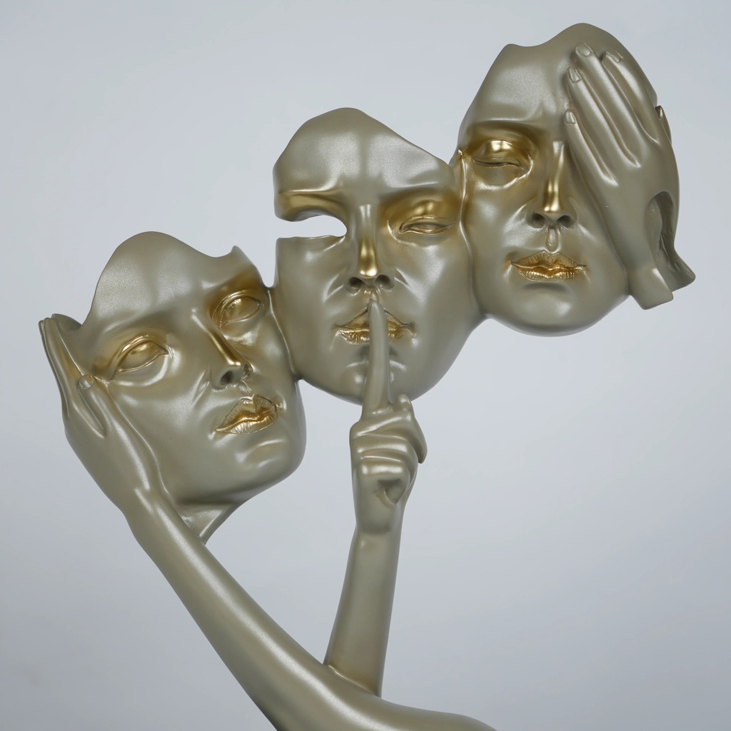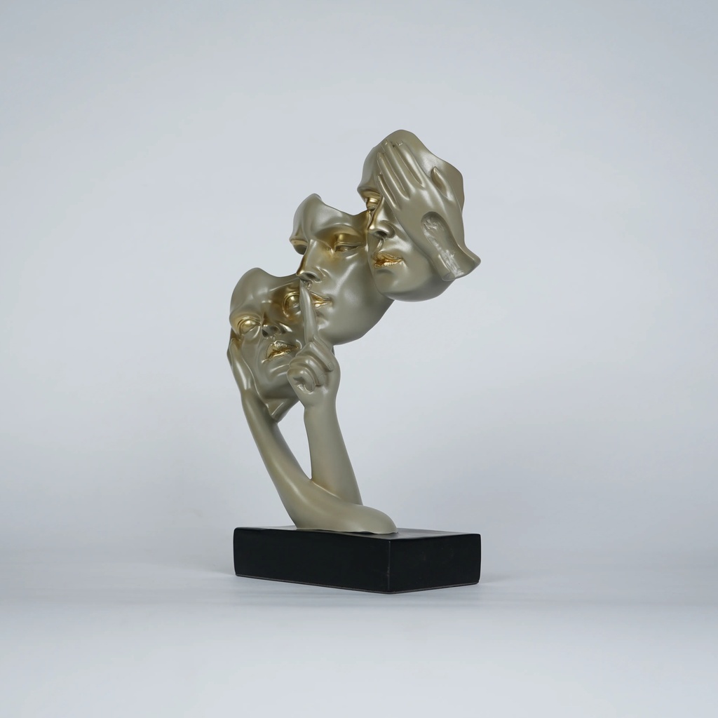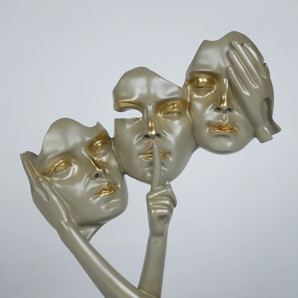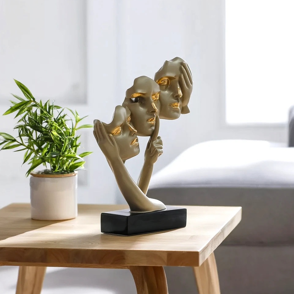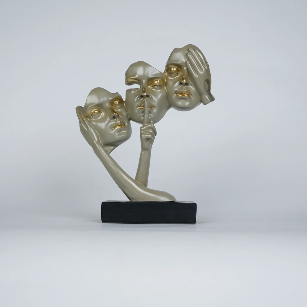 This stunning piece features three abstract faces emerging from a single, fluid form, each expressing a unique emotion: thoughtfulness, introspection, and calm. It’s a design that invites onlookers to pause and reflect, adding depth and interest to your home decor. The matte gold finish, highlighted with metallic gold accents, catches the light beautifully, making it a standout piece on any surface.
