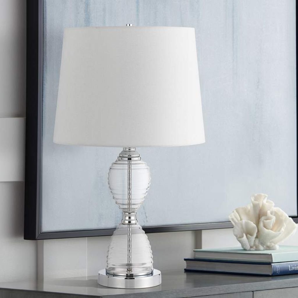 Ribbed clear glass shaped into a modified hourglass silhouette gives this glass accent lamp a light, airy presence that works in spaces where heavier ceramic or resin bases would feel out of place. Chrome finish metal accents frame the glass body cleanly, and a white linen tapered drum shade keeps the look polished without overcomplicating it.