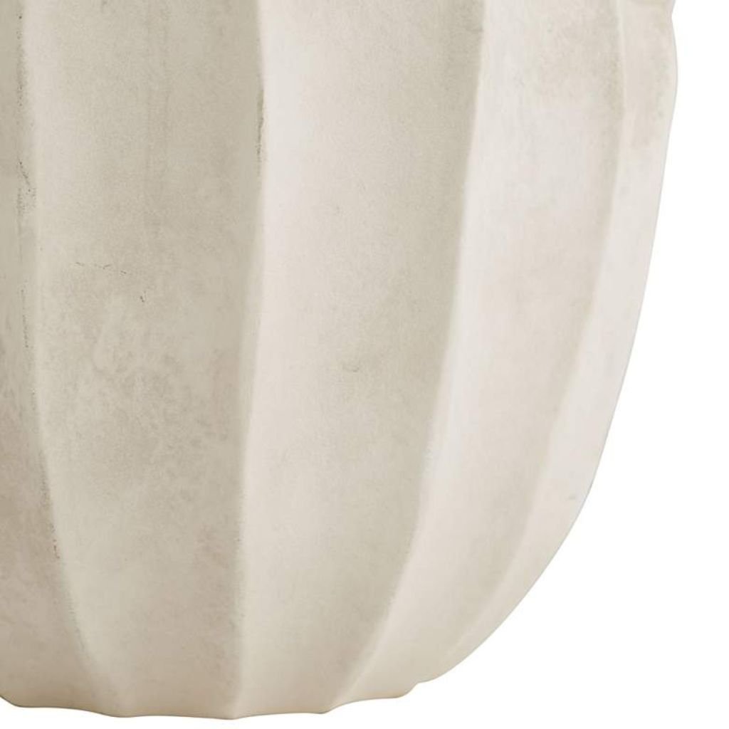 The gourd silhouette is a classic form made distinctive here by the linear groove detailing pressed into the surface before glazing. The white eggshell finish settles into those grooves with slight tonal variation, giving the lamp depth that a smooth, uniform glaze would not achieve. Each piece is individually finished, lending a quiet uniqueness to every lamp.