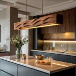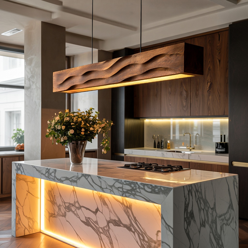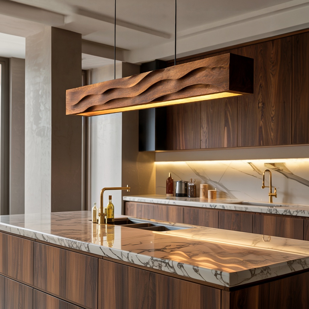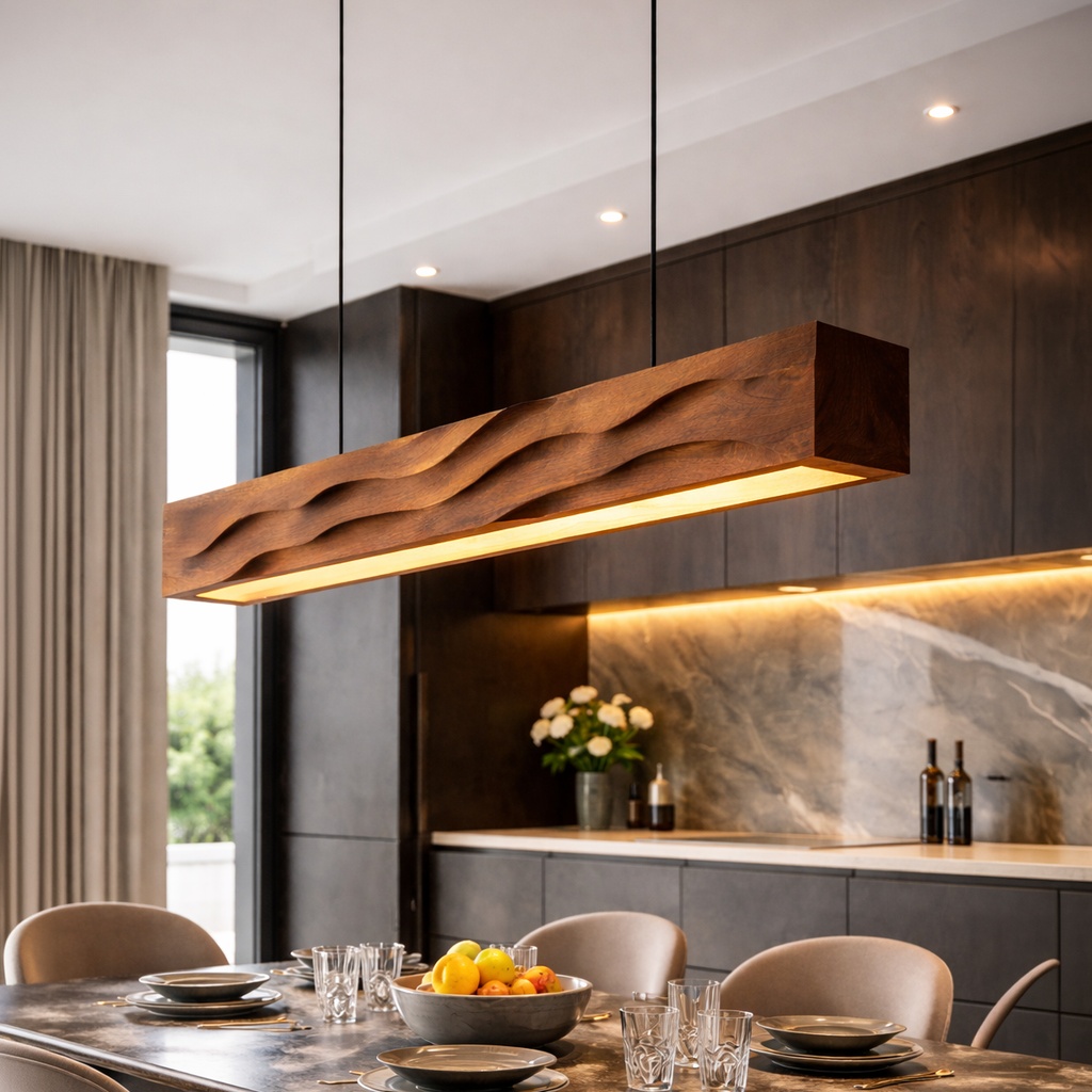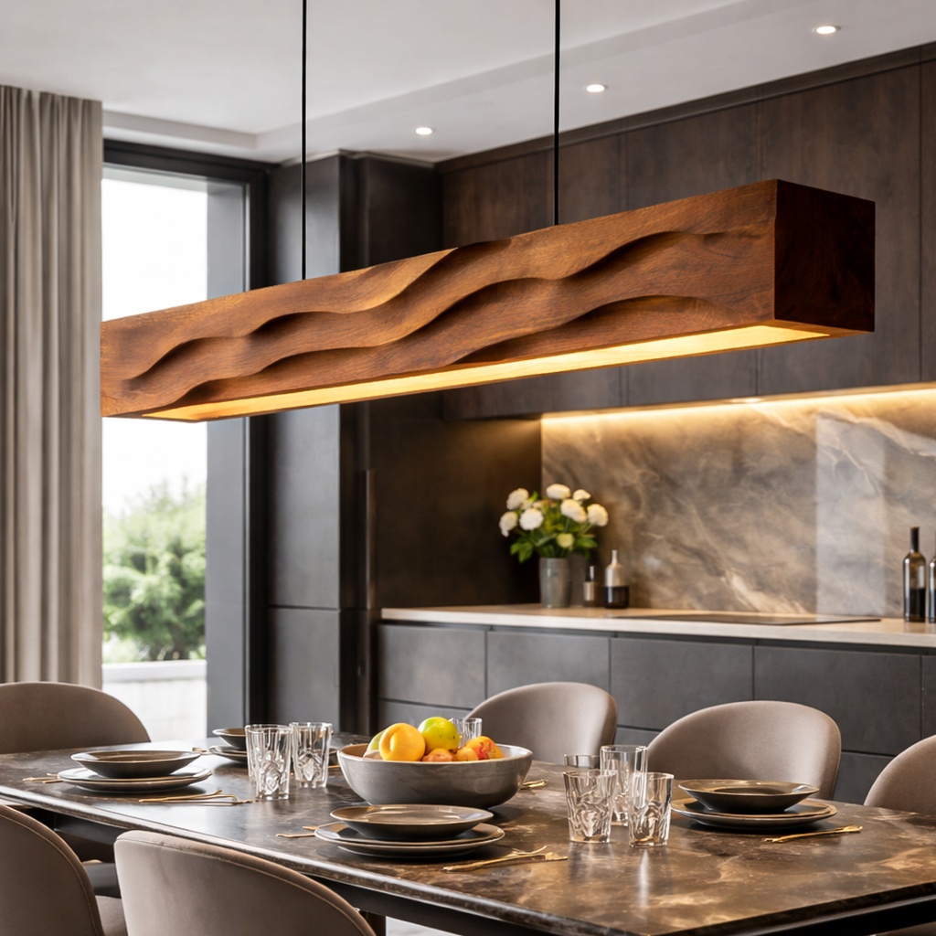 This dining light features a sleek, rectangular shape with beautiful wave-like carvings. The design isn’t just for looks—these contours play with the light, creating a dynamic visual effect above your table. With its slender suspension cables, it seems to float, drawing your eyes to its exquisite wooden form.