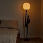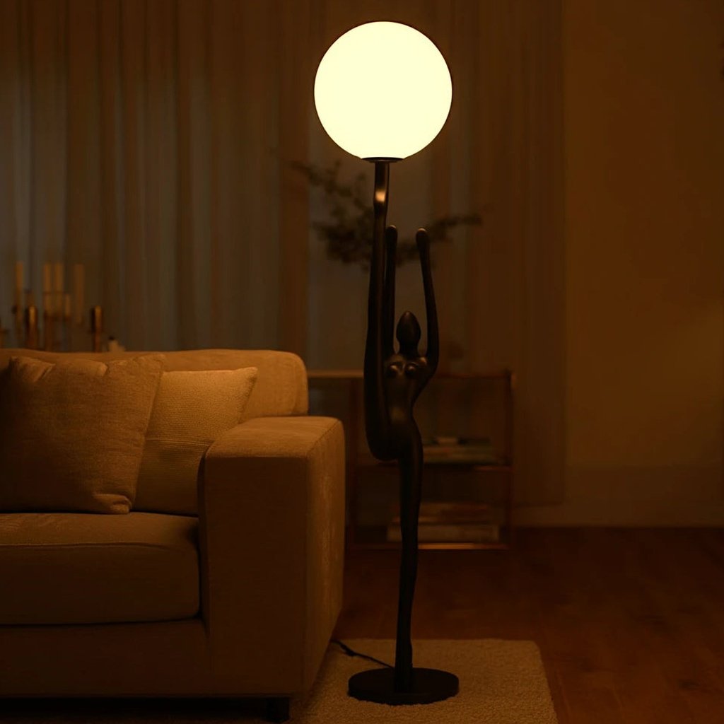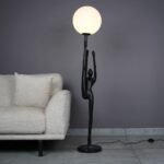Crafted from premium-quality resin, this lamp features a tall, elongated human figure in a fluid stretch pose, holding a luminous orb. This design symbolizes the strength and grace of the human form, making it more than just a lighting fixture—it’s a piece of art. The sculpture’s matte black finish beautifully contrasts with the soft, warm glow of the orb, enhancing its visual appeal.