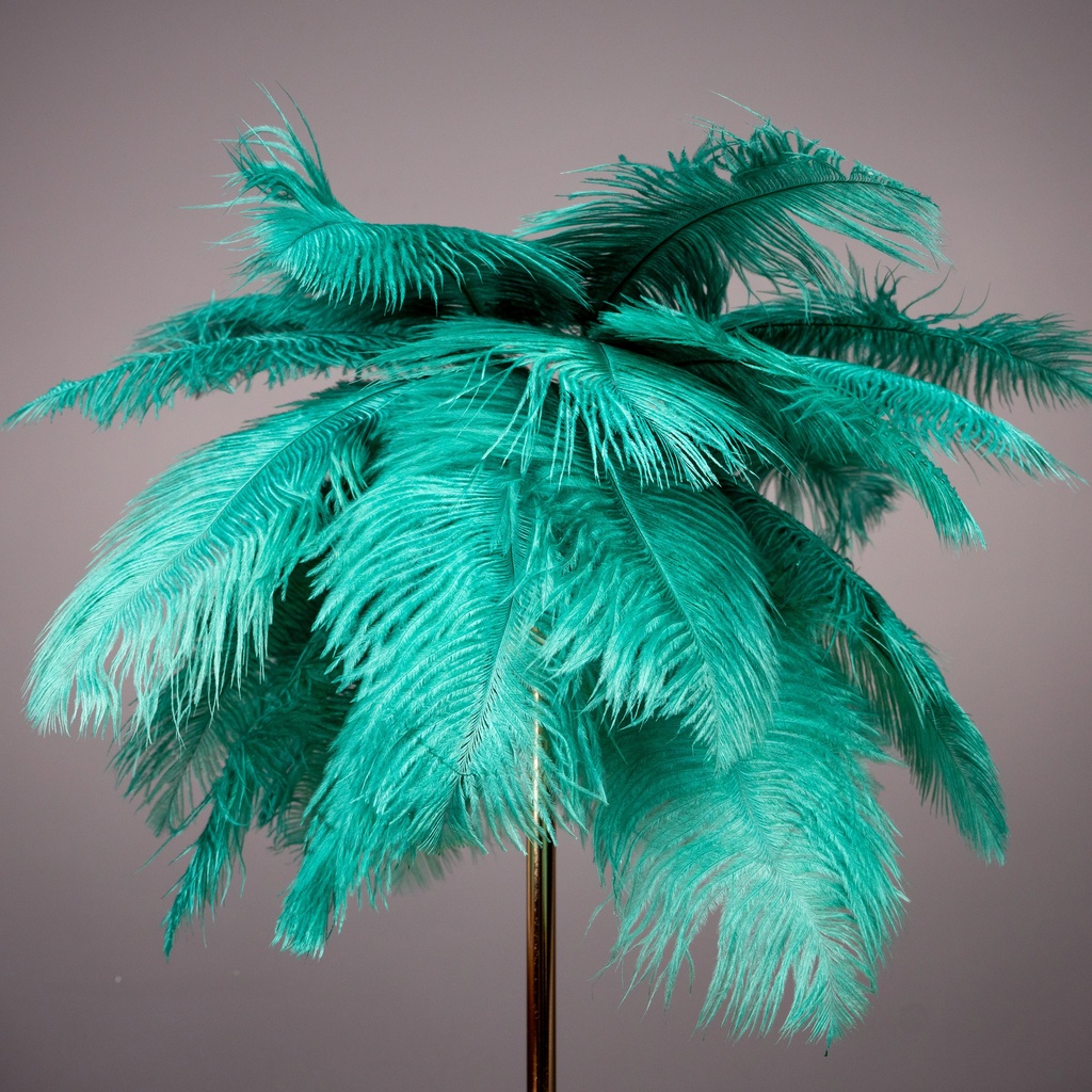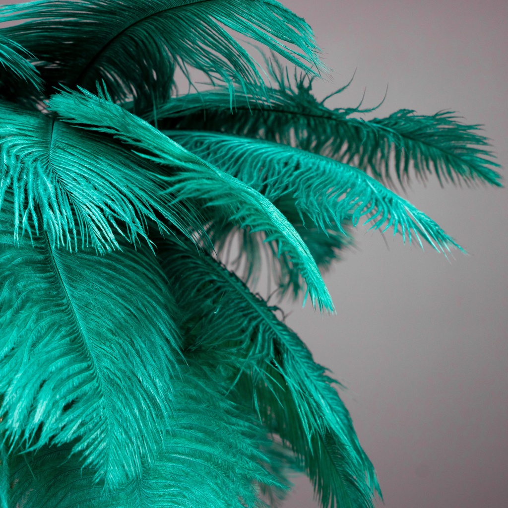 The deep green feathers carry a lushness that pairs naturally with velvet upholstery, brass accents, dark wood furniture, and richly layered interiors. The emerald tone shifts subtly depending on available light — cooler in natural daylight, warmer and more saturated under artificial evening light.