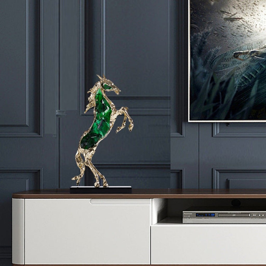 The Emerald Gallop Luxury Horse fits seamlessly into modern, contemporary, or eclectic decor styles. Its rich color palette makes it versatile enough to complement neutral tones or stand out in bolder settings. Whether it stands alone or with other pieces, it adds sophistication wherever it resides.