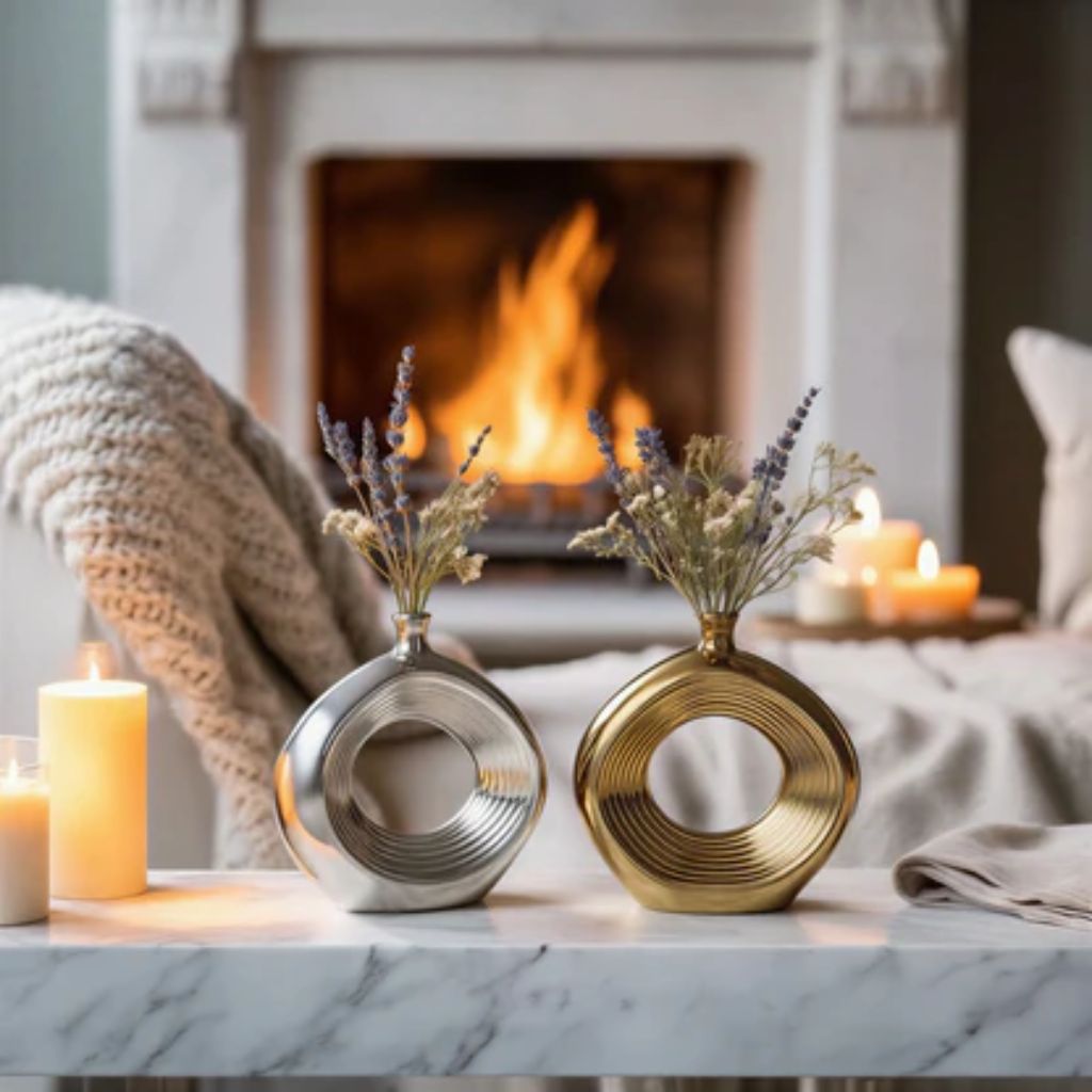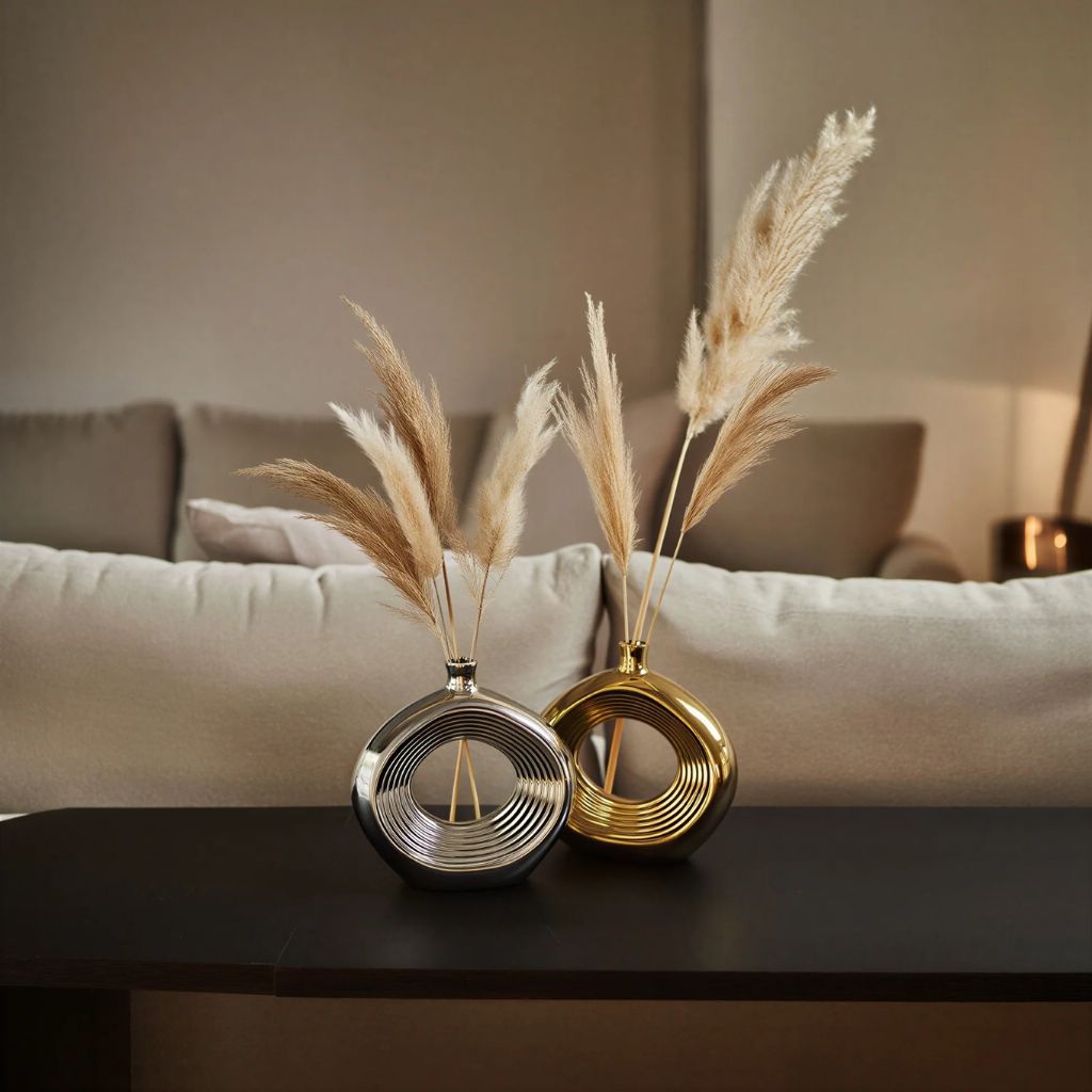 This sculptural vase set is built around a circular hollow ceramic form with concentric detailing that creates genuine visual rhythm across a smooth metallic surface. The concentric rings add depth without adding bulk — the design stays open, light, and architectural. Available in Silver and Gold, both finishes carry a polished, gallery-quality appeal suited to modern and luxury interiors.