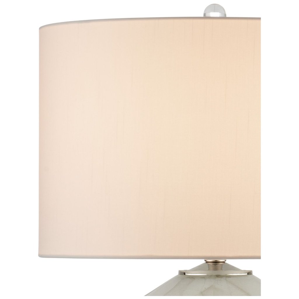 Beneath the glass body sits an optic crystal base that adds clarity and visual depth to the overall form. Polished nickel hardware ties the two elements together cleanly, keeping the look refined without overpowering the lamp’s delicate color palette.