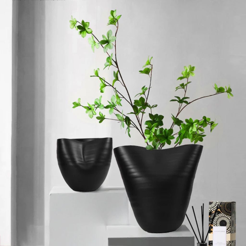 A fluid, asymmetrical rim rising from a smoothly contoured resin body gives this decorative vase its organic, movement-driven character. The gently curved crest creates a natural focal point that encourages relaxed floral placement while the overall silhouette remains clean, balanced, and contemporary in white and black.