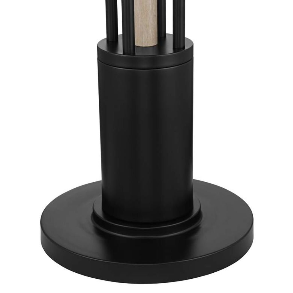 This tall floor lamp features an open metal frame composed of four sleek rods finished in black. A faux wood center column introduces warmth, creating contrast against the dark metal structure.