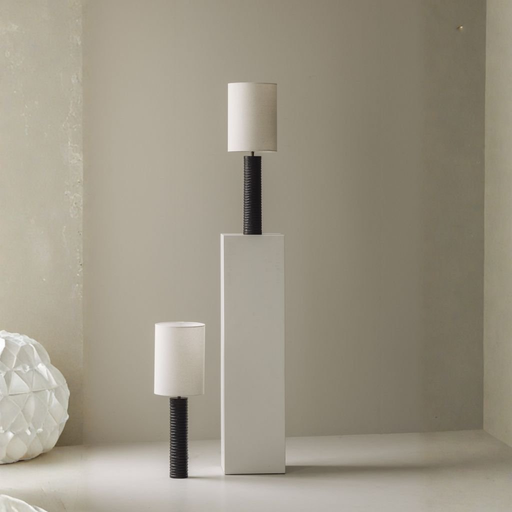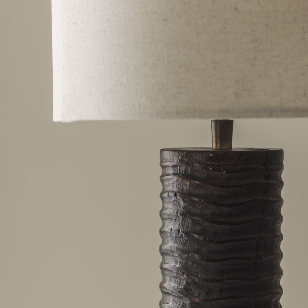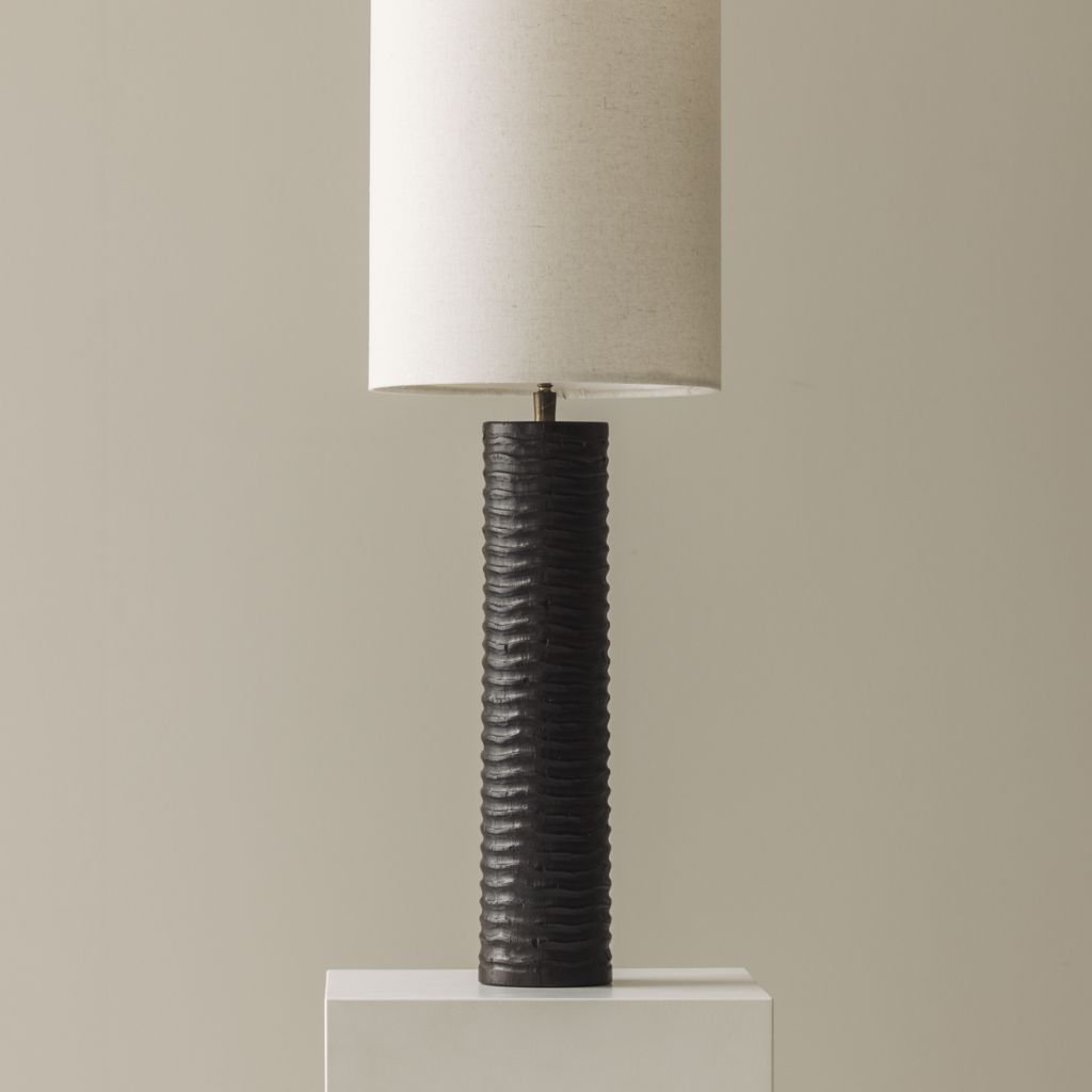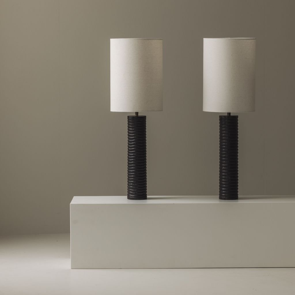 The vertical carved pattern running the length of each base creates depth and shadow that shifts with the light. The dark finish enhances the texture, giving each lamp a sculptural weight that reads beautifully from across a room.