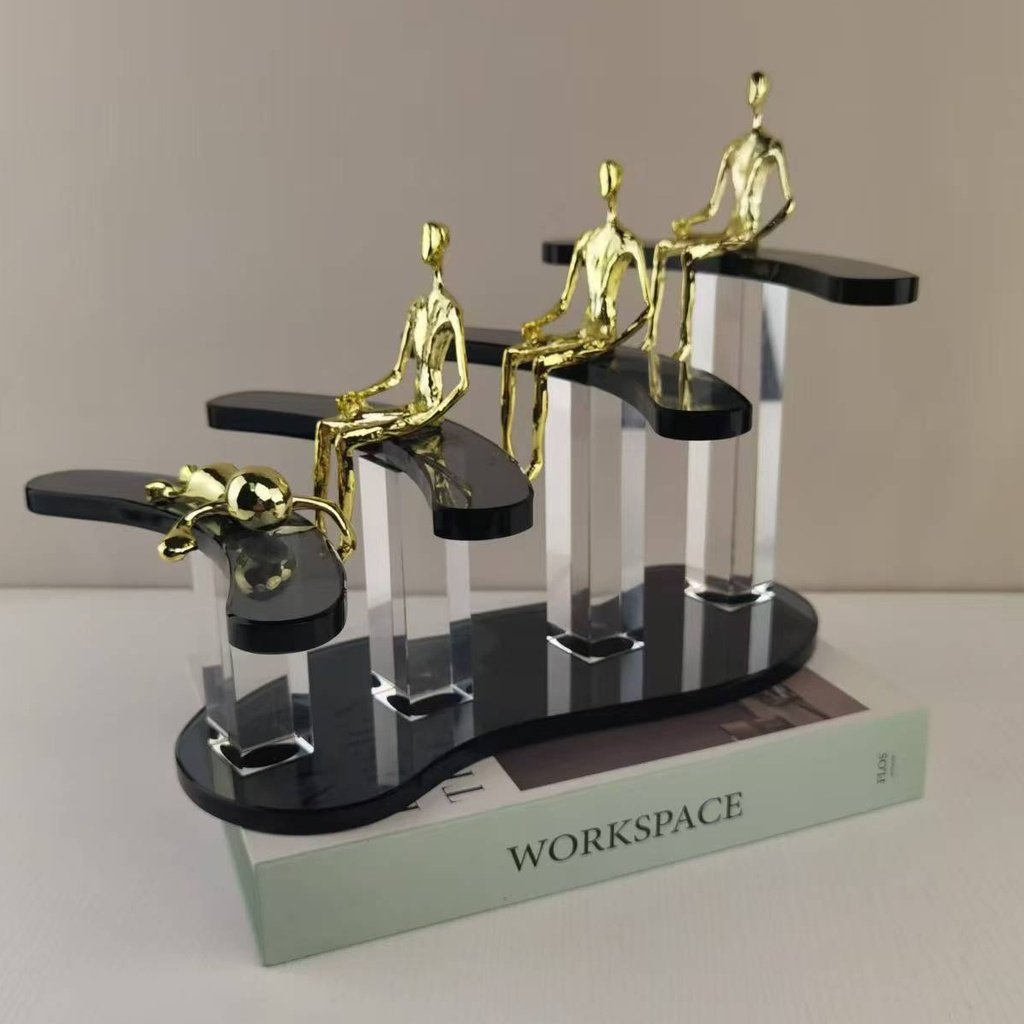 Golden Ascend Form is more than a decorative object; it is a visual narrative that tells a story of progression and growth. Featuring a series of abstract gold figures poised along tiered glass steps, each level represents a new phase of elevation. This intentional arrangement invites the viewer to reflect on themes of ambition and personal development, making it a compelling centerpiece for any room.