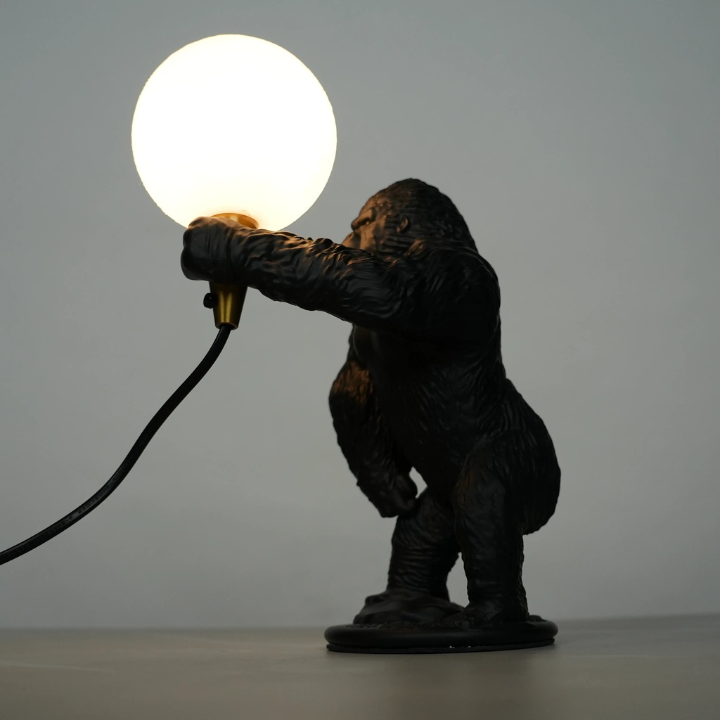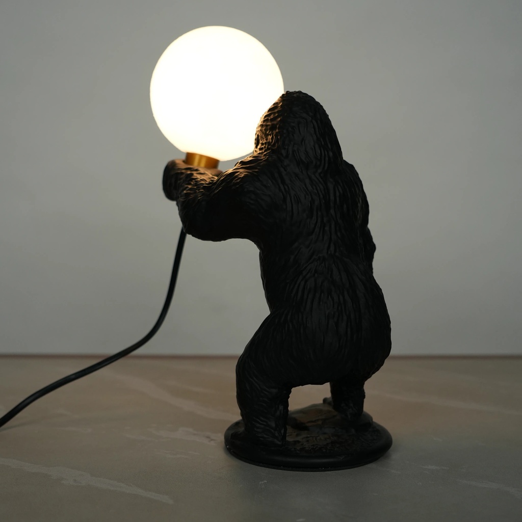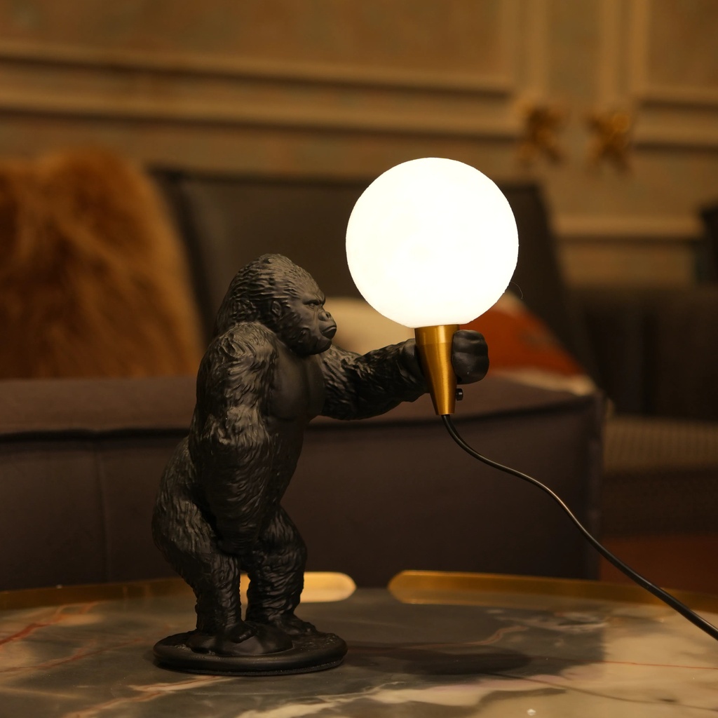 This sculptural table lamp features a powerfully built gorilla figure in a matte black textured finish, holding a warm glowing orb in a gold lamp holder — a pairing that is immediately arresting and genuinely original. The sculpture is detailed enough to hold attention as a standalone art object, yet compact enough to work on a desk, bar surface, bedroom side table, or office shelf without overwhelming the space. Bold without being excessive, it suits anyone who wants lighting that starts conversations.
