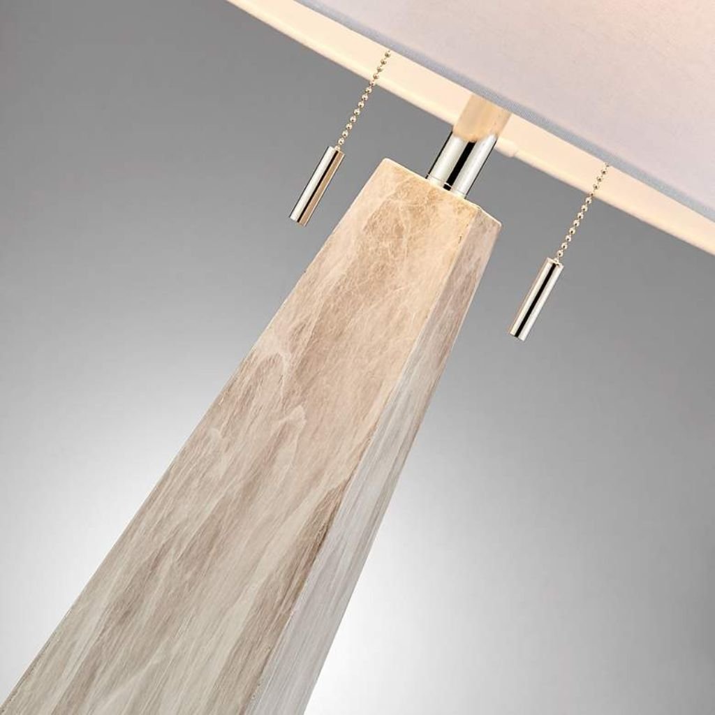 Standing 29 inches high, the lamp features a 5-inch-wide cast resin base finished to mimic soft gray marble. Faceted crystal accents enhance the base with a touch of sparkle, creating visual interest while maintaining a modern, streamlined silhouette. The textured faux marble finish adds depth and dimension, blending classic elegance with contemporary style.