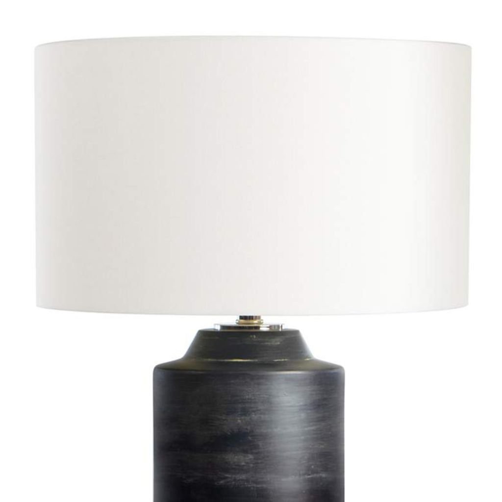 The linen shade adds brightness and simplicity, allowing the textured ceramic base to remain the focal point.