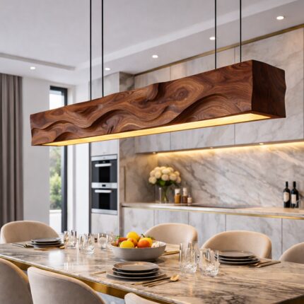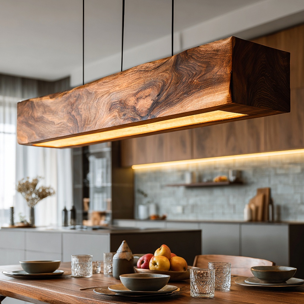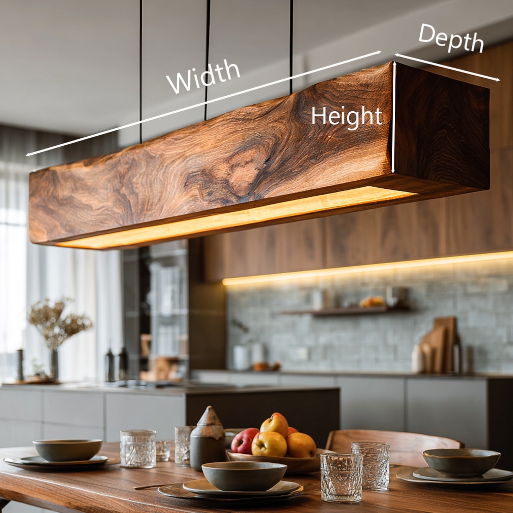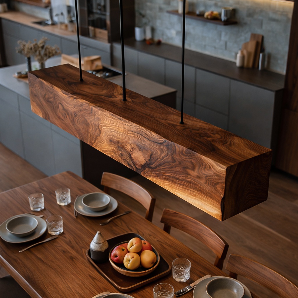 This pendant light exudes a calm, floating presence with its sleek, rectangular wooden body. Suspended by slim cables, it appears to hover gracefully, casting a soft, even glow over your dining table or kitchen island. The clean edges and natural wood grain make it a harmonious addition to any modern interior.