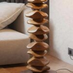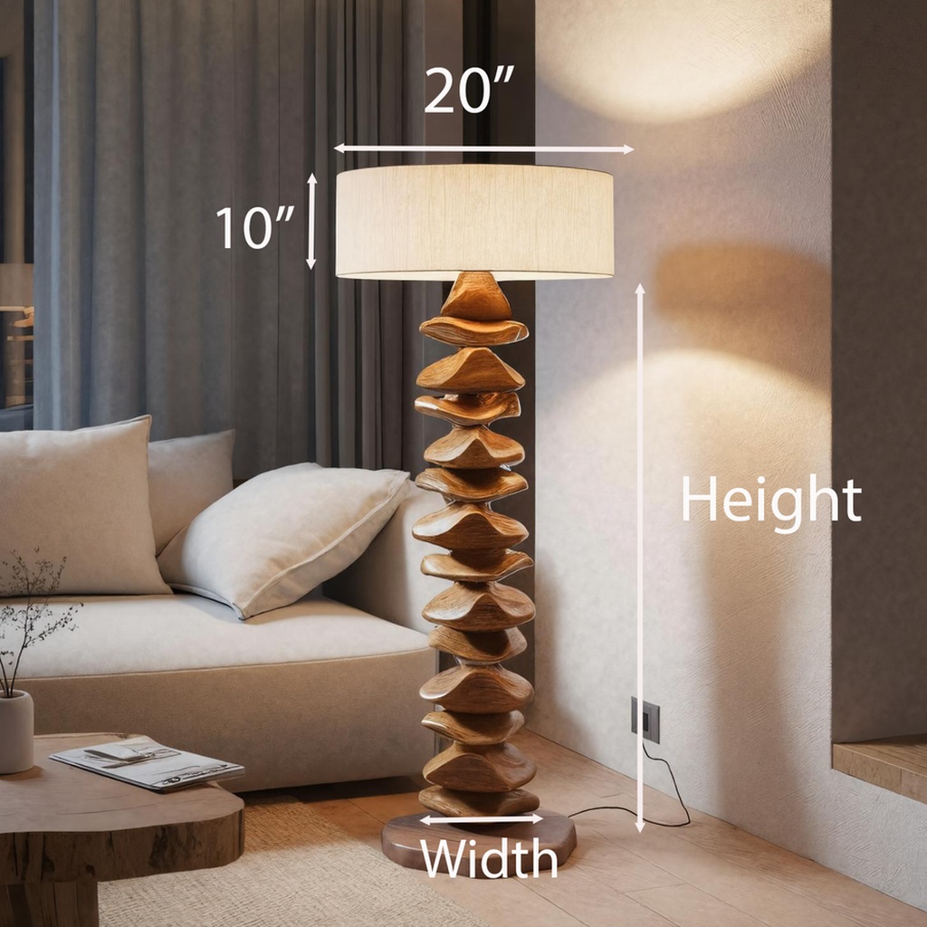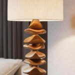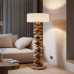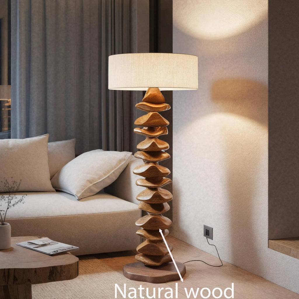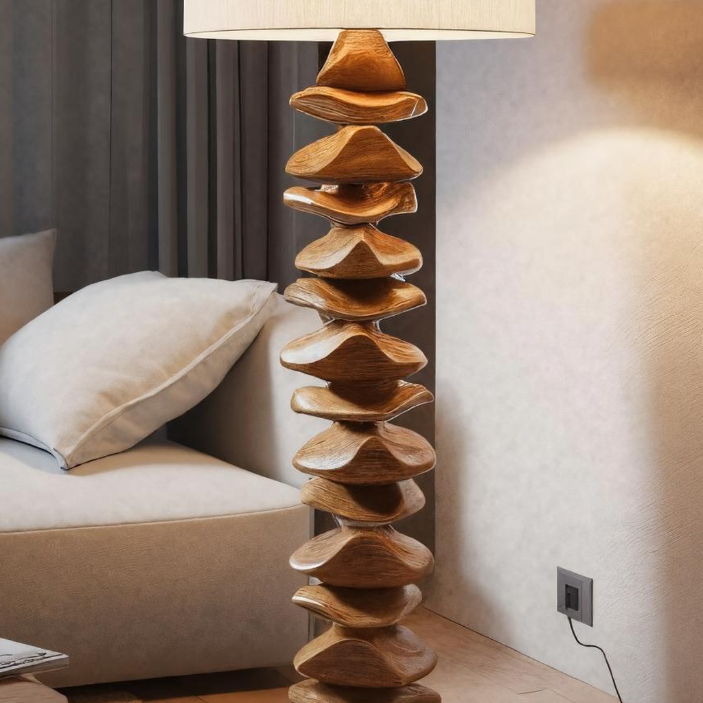This floor lamp features a hand-carved wooden base that stands out with its layered details. The combination of its bold silhouette and a soft fabric lampshade creates a warm, inviting glow. It’s an ideal choice for living rooms or lounges, where it can serve as both a functional and decorative element.
