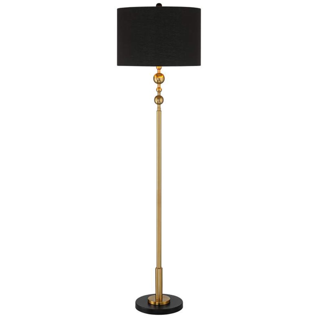 This floor lamp features a slender metal pole in a gold finish accented with decorative ball details near the top. The round base is finished in matte black, providing both stability and contrast.