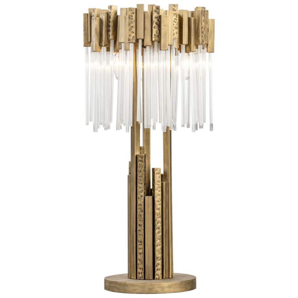 The Matrix stands 30 inches tall and 14 inches wide, with a base that matches that 14-inch width to provide a stable, grounded footprint on larger accent surfaces. At 29.6 pounds, the lamp’s weight is a direct reflection of its material quality — this is construction built for longevity, not portability. Three candelabra-base sockets require bulbs sold separately, and the Havana gold finish positions the Matrix naturally within modern glam, transitional, and contemporary interior schemes. Its scale makes it best suited to substantial surfaces — wide console tables, oversized nightstands, or statement sideboards — where its proportions can be fully appreciated rather than crowded.