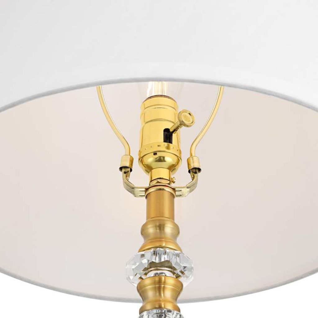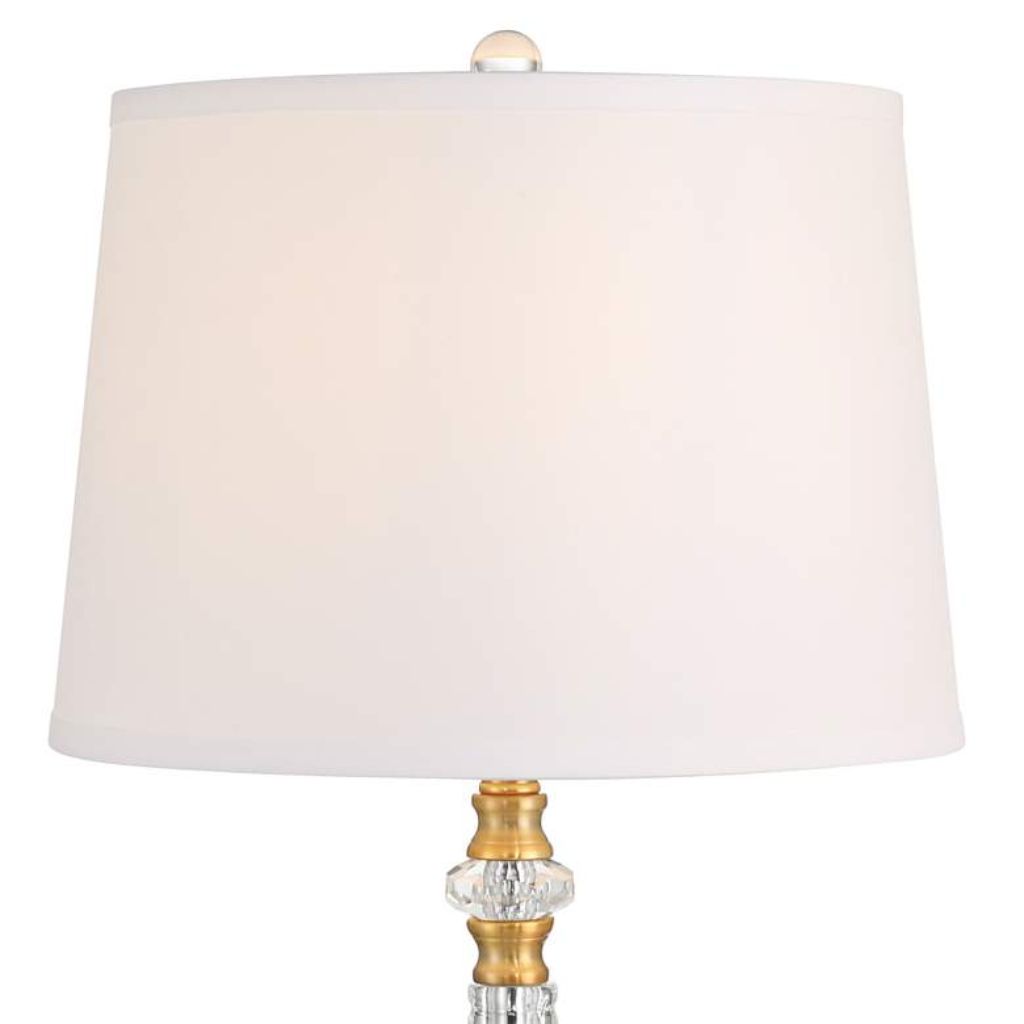 Standing 32 inches high overall, the lamp features a 6 1/4-inch wide base crafted from metal with a warm brass finish. Embedded crystal segments add a subtle sparkle, catching and reflecting light to enhance the lamp’s visual appeal. The combination of brass and crystal gives the piece a luxurious yet airy presence.