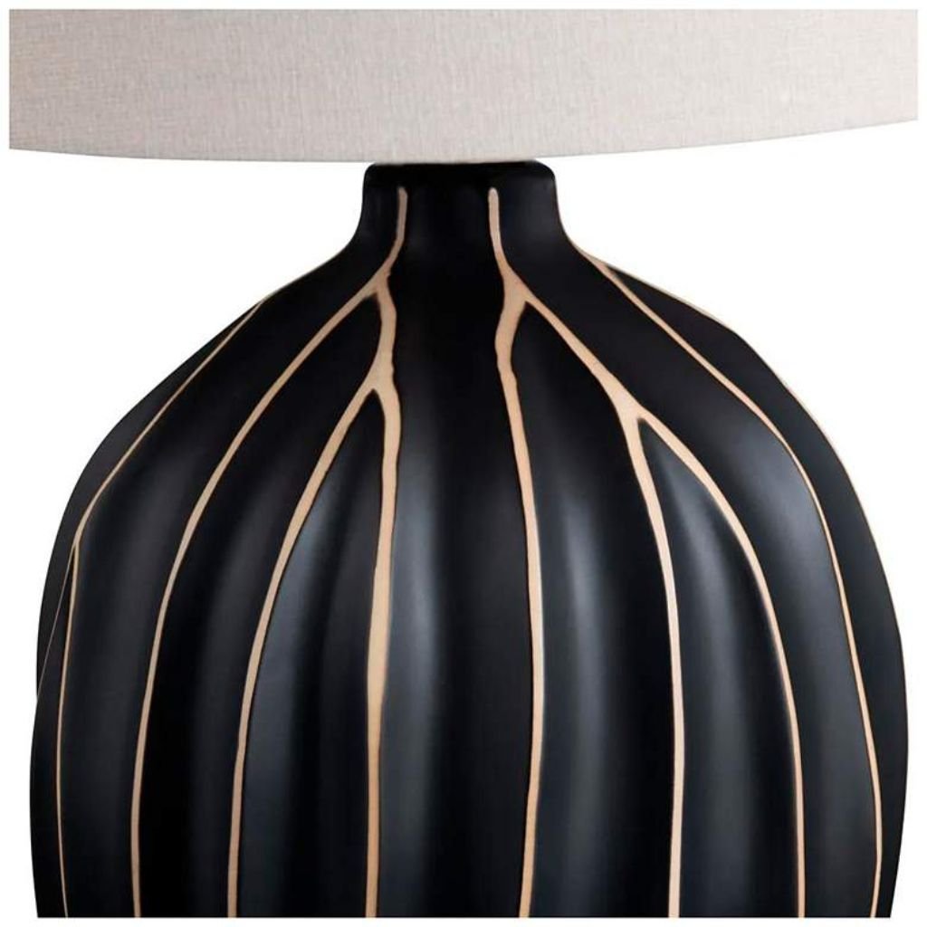 Standing 26 inches high overall, the ceramic base measures 9 inches at its widest point. Finished in rich black, the base features vertical gold stripes and ridge detailing that create dimension and visual interest. The combination of dark tones and metallic accents gives the lamp a sophisticated, modern edge while maintaining timeless appeal.
