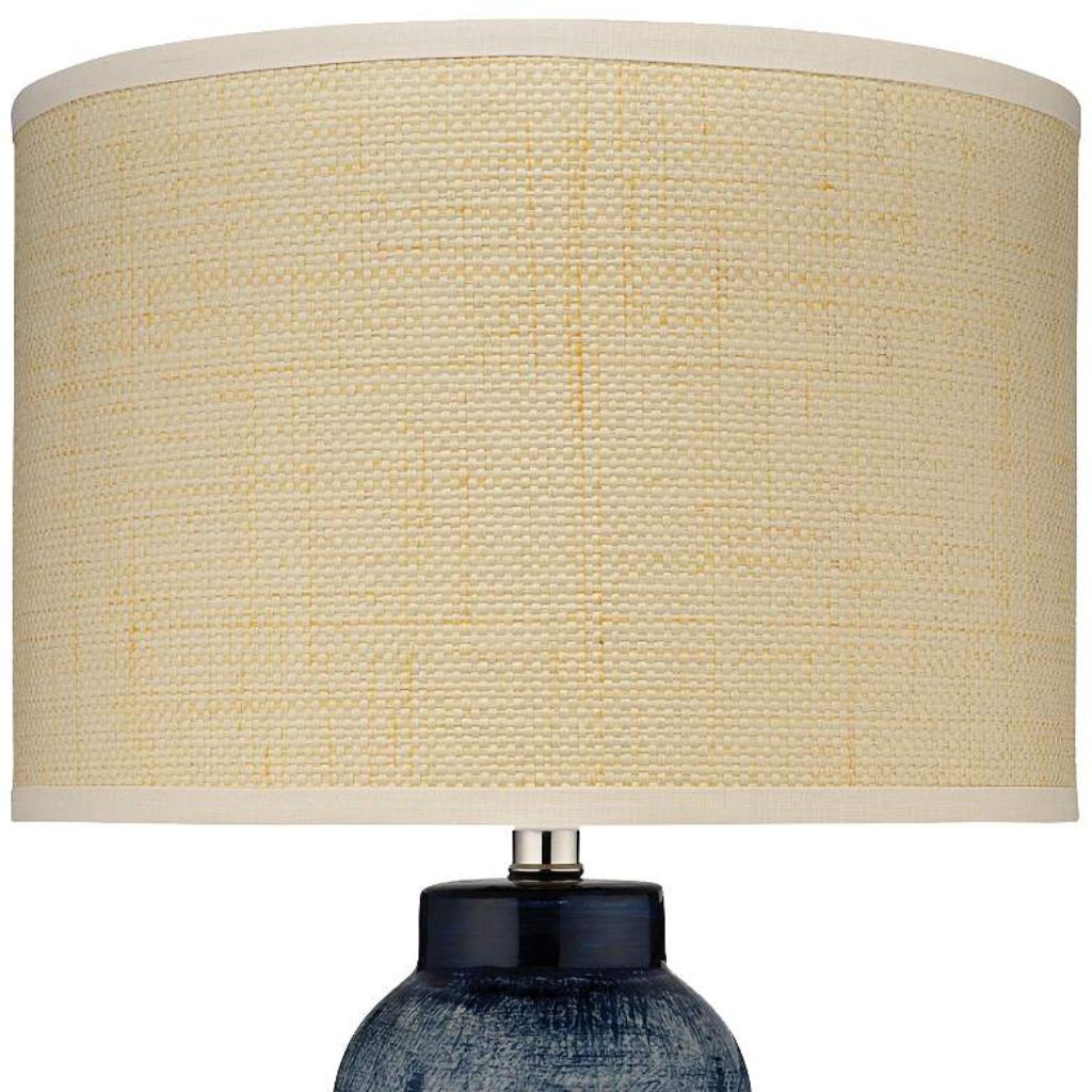 The off-white raffia drum shade brings a woven, natural texture to the top of the lamp that pairs effortlessly with the blue and white ceramic below. Raffia’s organic character suits coastal and globally-inspired interiors particularly well, adding warmth and tactile interest without introducing additional color.