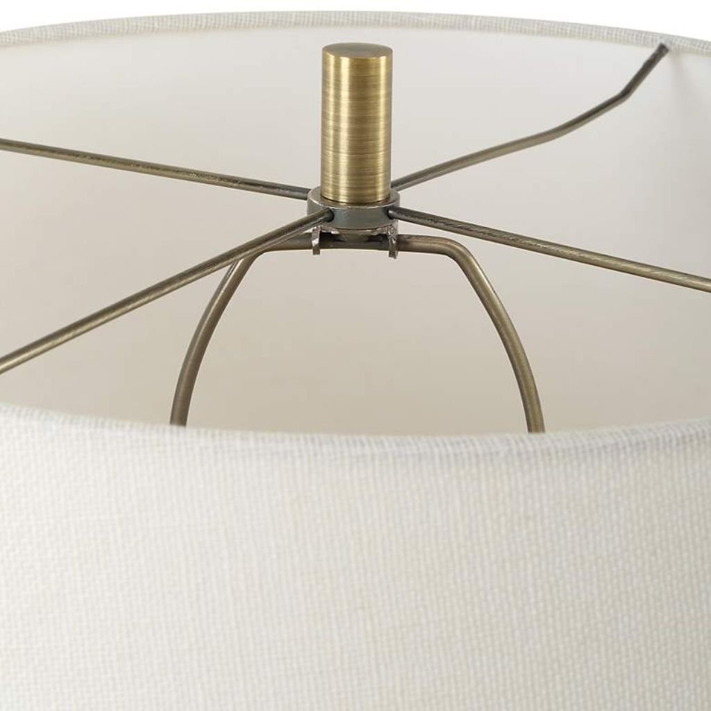 Weighing 12 lbs, this travertine table lamp combines texture, elegance, and practicality. The antique brass base grounds the organic form, while the sculpted body and crisp linen shade create an eye-catching statement piece. The Juliet lamp from Uttermost is perfect for bringing artistic flair and effortless sophistication to modern interiors.