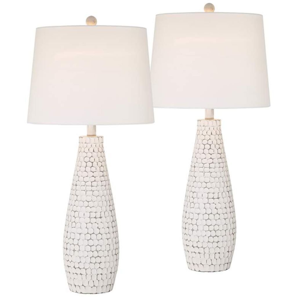 • White and beige speckled dot ceramic bases with a whitewash finish