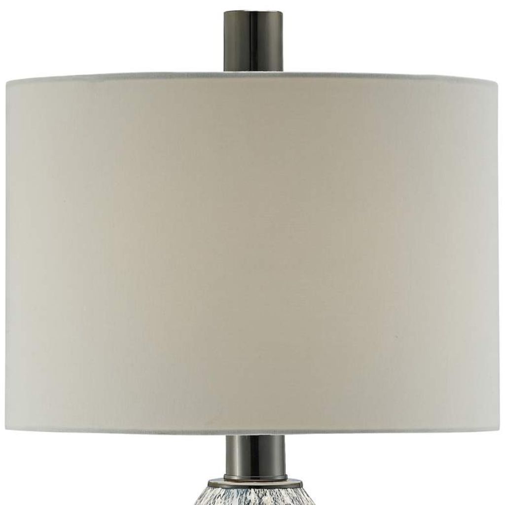 The Logan glass table lamp from Crestview Collection is a sophisticated addition to any room, combining artistic glasswork with practical lighting features. Its bold black and white pattern, paired with sleek metal accents and a classic linen shade, ensures that this lamp is both a functional light source and a captivating decorative element.
