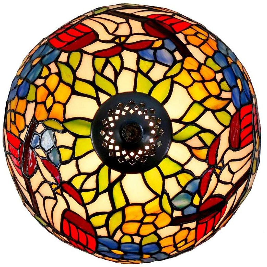 • Dome shade in yellow and peach adorned with blue and orange florals