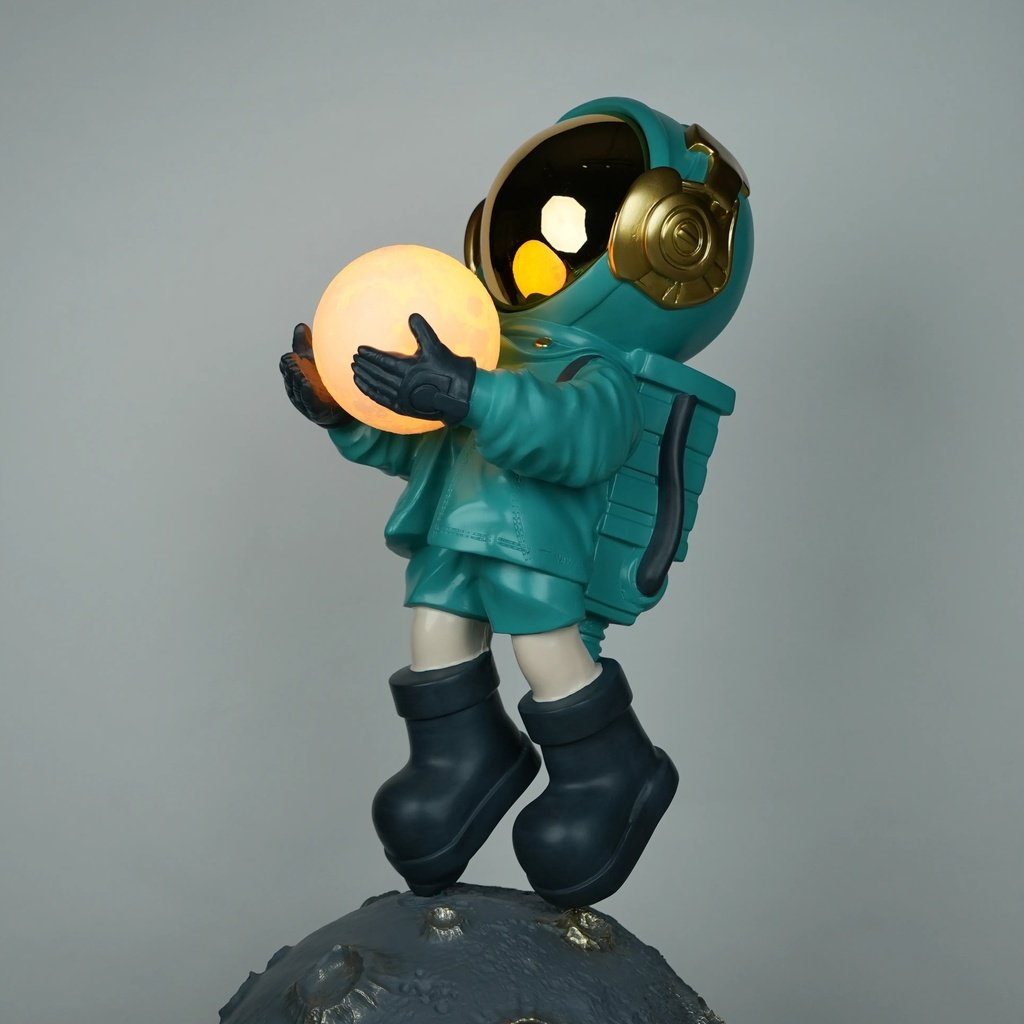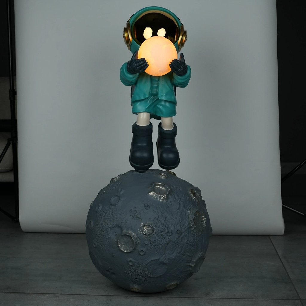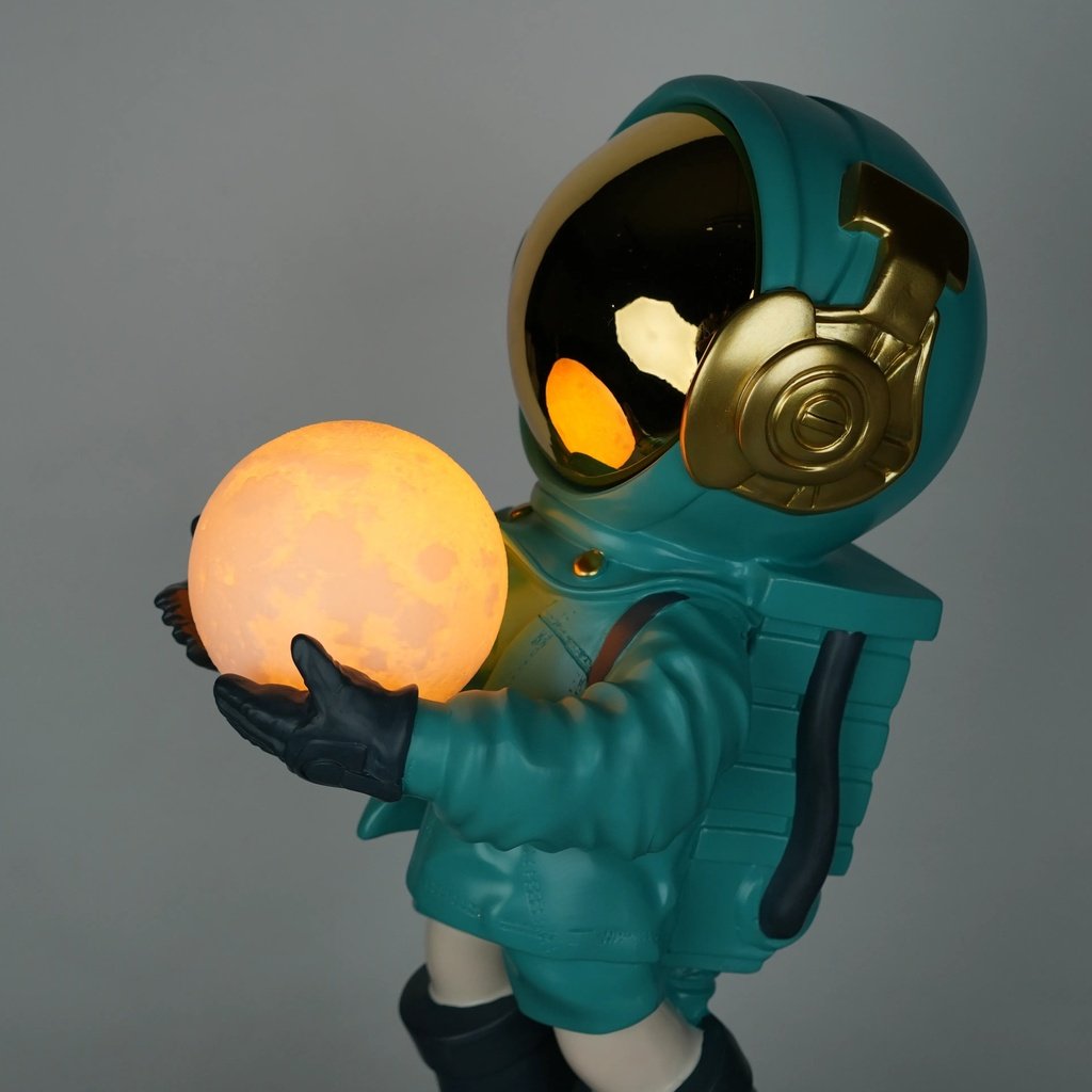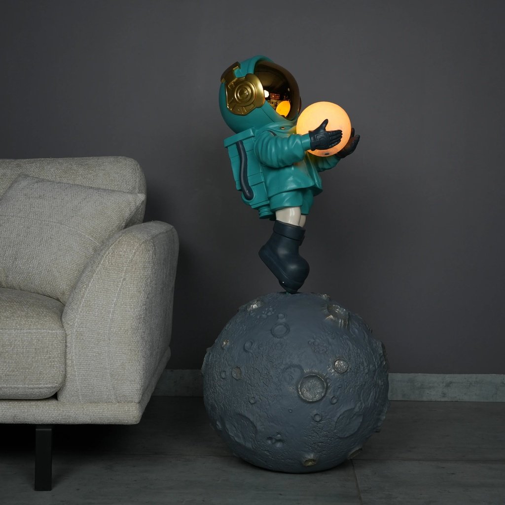 Crafted from high-quality resin, this lamp is more than just a light source; it’s a statement piece. The attention to detail in the astronaut’s suit, gloves, and boots, combined with the realistic cratered moon base, creates a dynamic sculpture that is both visually and texturally engaging. The chrome-gold visor adds a sophisticated touch, reflecting its surroundings and enhancing the lamp’s futuristic allure.