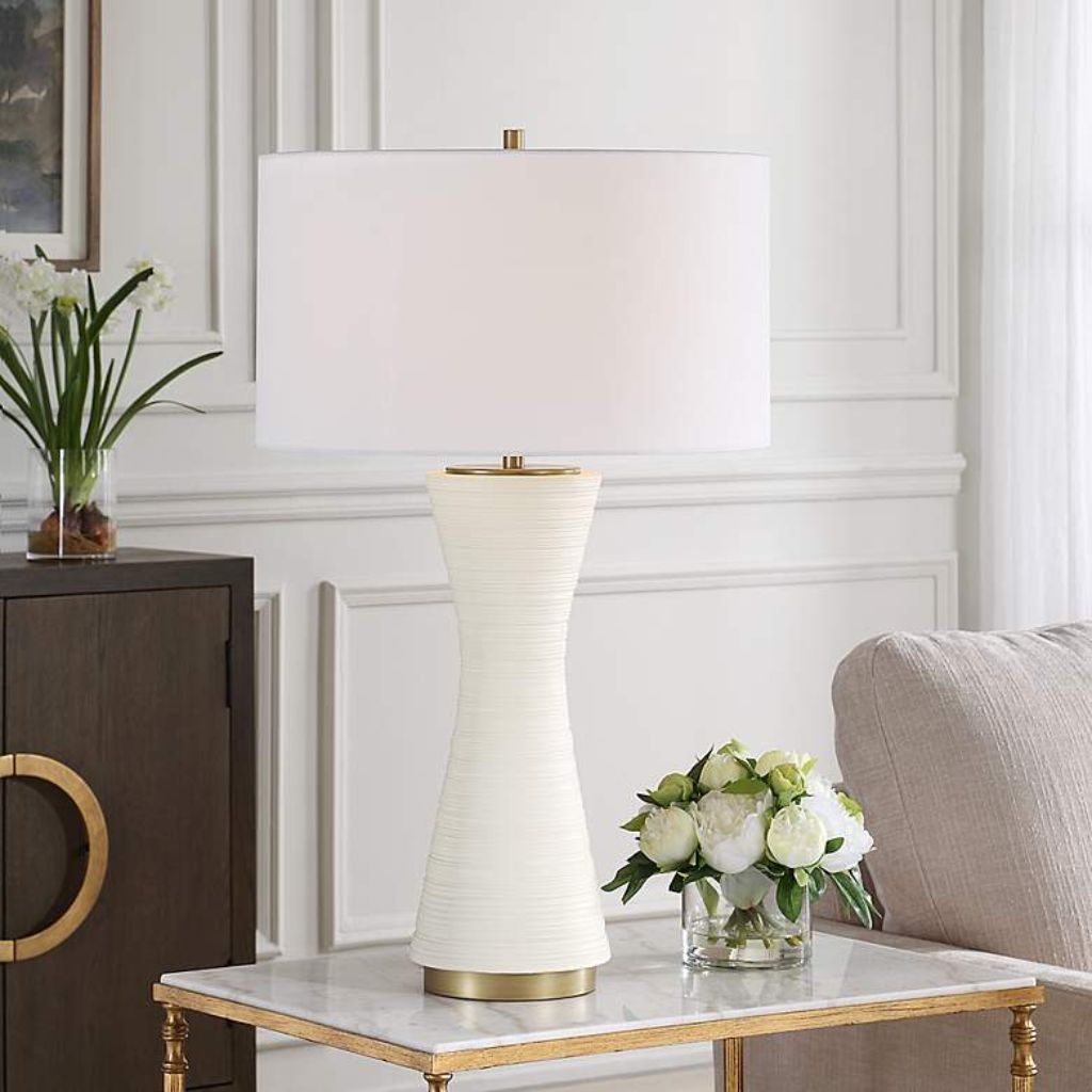 The Uttermost Ridgeline table lamp is a stylish, modern lighting solution that blends clean lines with functional design. Standing 29.8 inches tall, this lamp is both compact and impactful, perfect for side tables, nightstands, or accent surfaces.